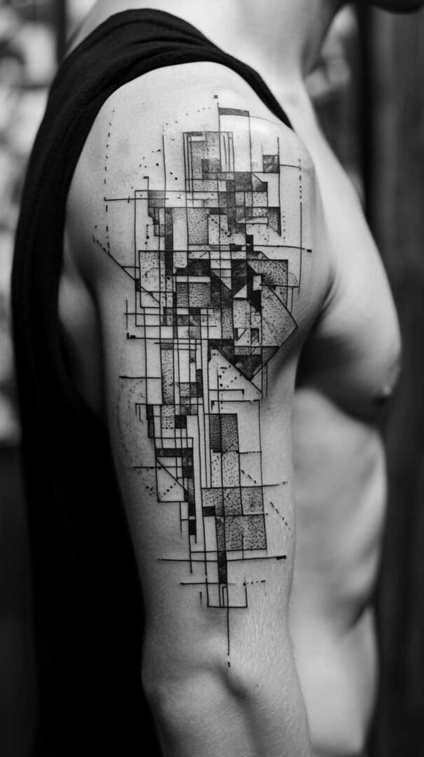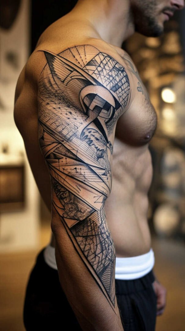 When it comes to abstract tattoos for men, certain designs stand out for their adaptability and visual punch. Here, we highlight some favorites, described in detail to inspire your imagination. Remember, these are elevated to 4K HD standards, meaning ultra-sharp edges and profound depth.