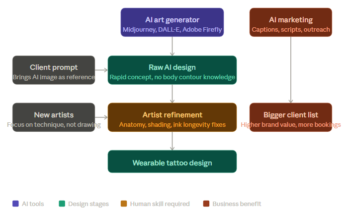 The tattoo industry has seen this dynamic before. When rotary machines replaced coil machines for many applications, artists who dismissed them as inferior were eventually surpassed by those who learned to use both. When Instagram emerged, artists who ignored it found their client lists shrinking as clients sought out artists they could discover online. When Procreate became a standard design tool, artists who refused to use tablets found themselves spending far more time on drawings than their digitally fluent peers.