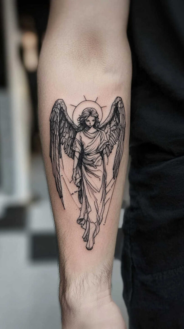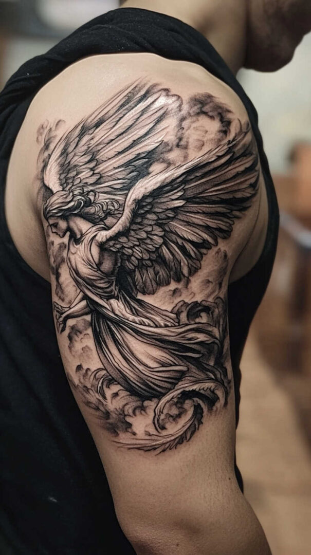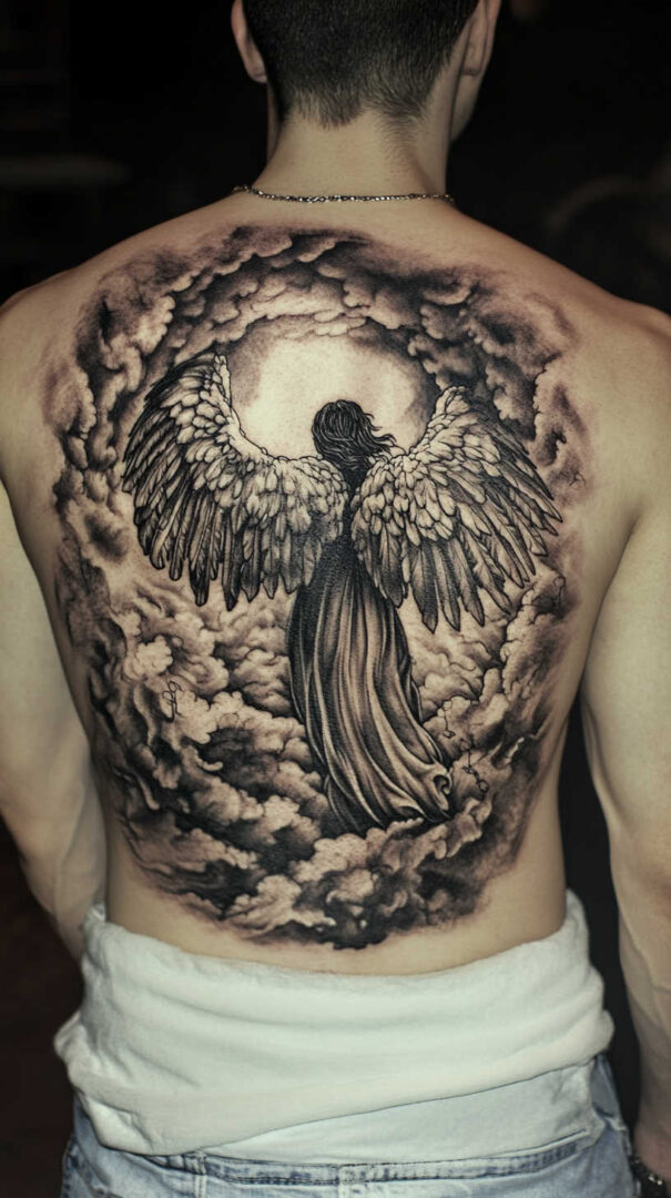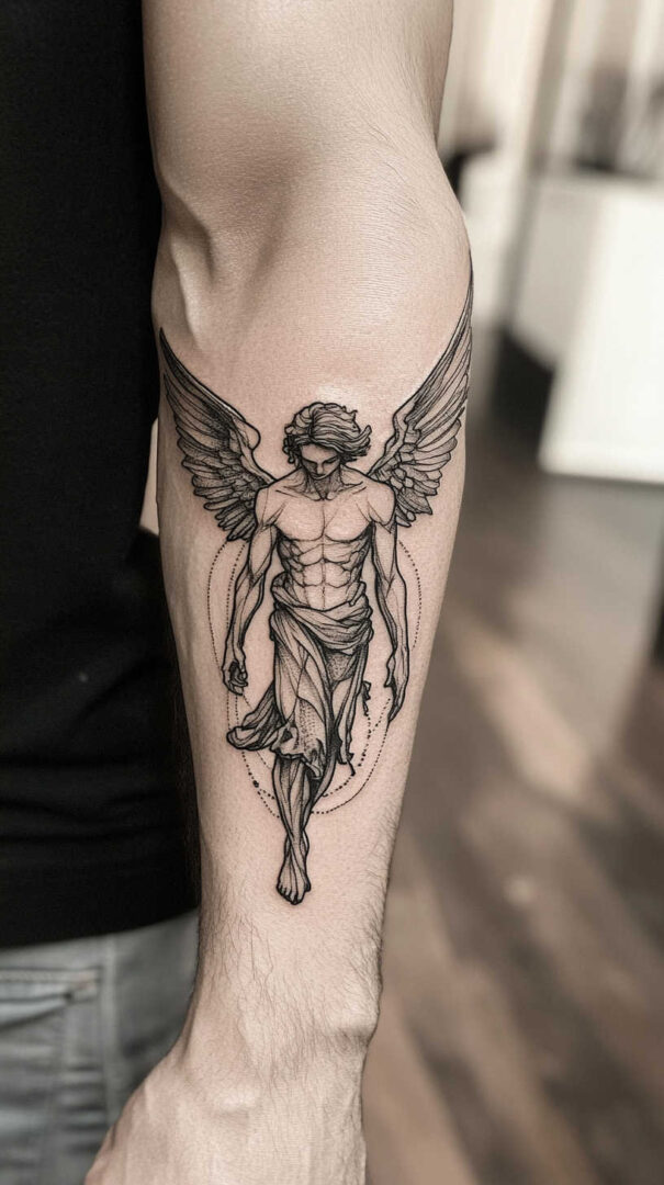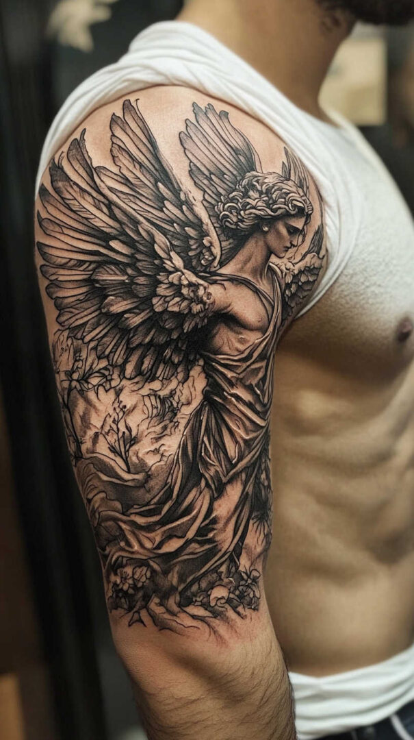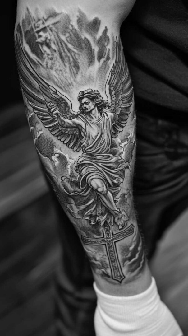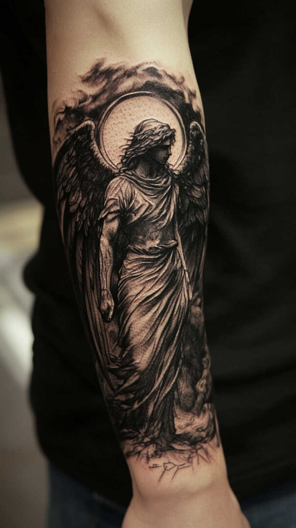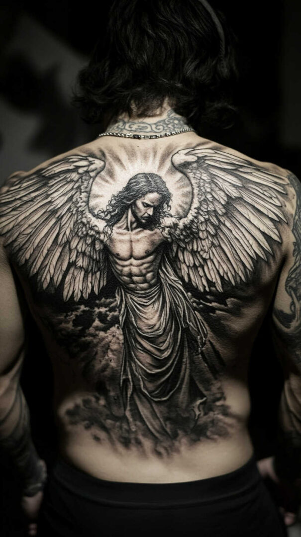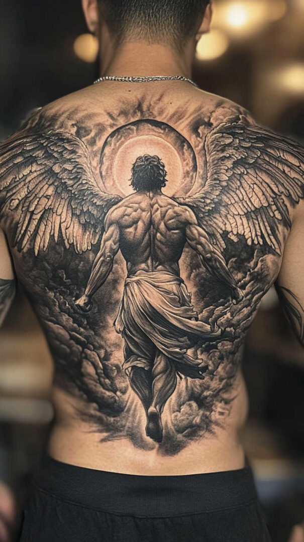 These symbols make angel tattoos powerful personal talismans of resilience, morality, and spiritual armor.
