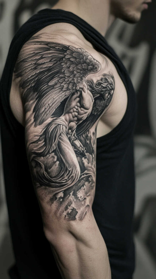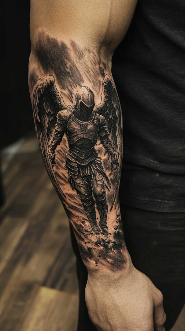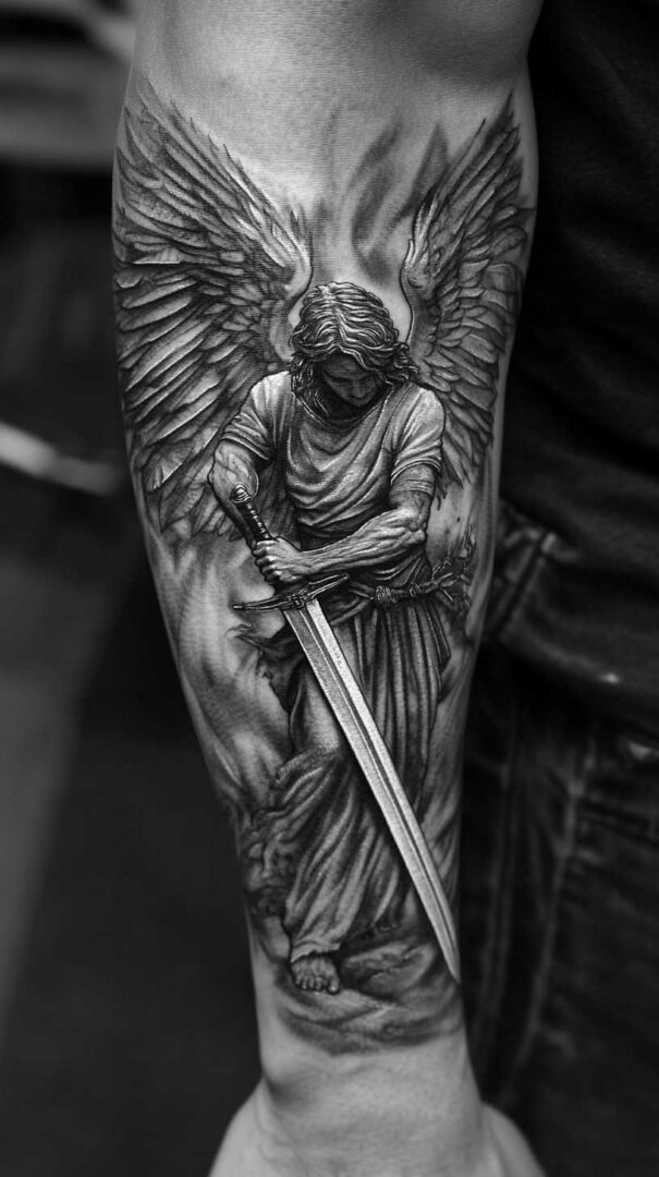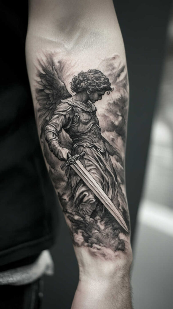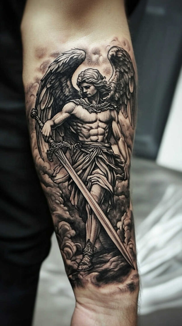 Black-and-grey realism excels in creating dramatic depth, stone-like textures, and emotional intensity—timeless for men. Selective gold, white, or blue accents highlight halos, swords, or feathers for divine emphasis without overpowering.