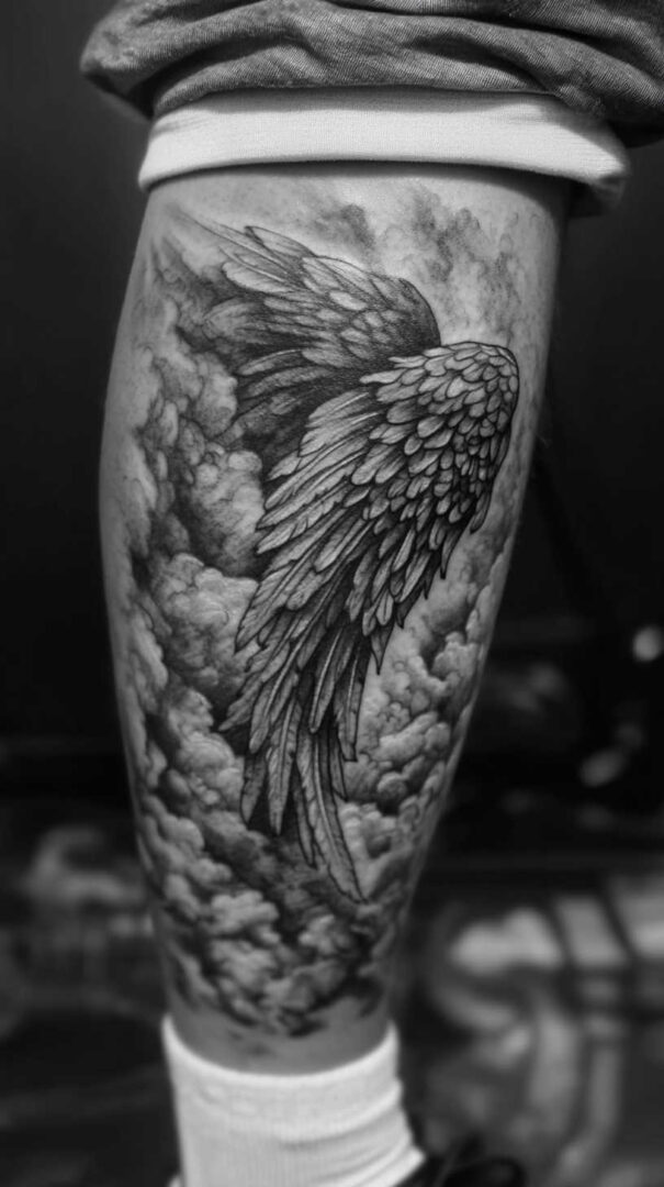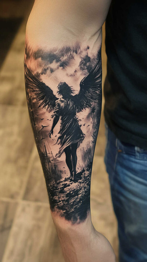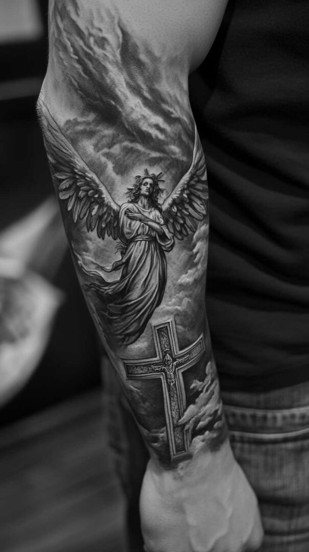 - Forearm — Smaller wings, praying hands, or symbolic elements for daily reminder.