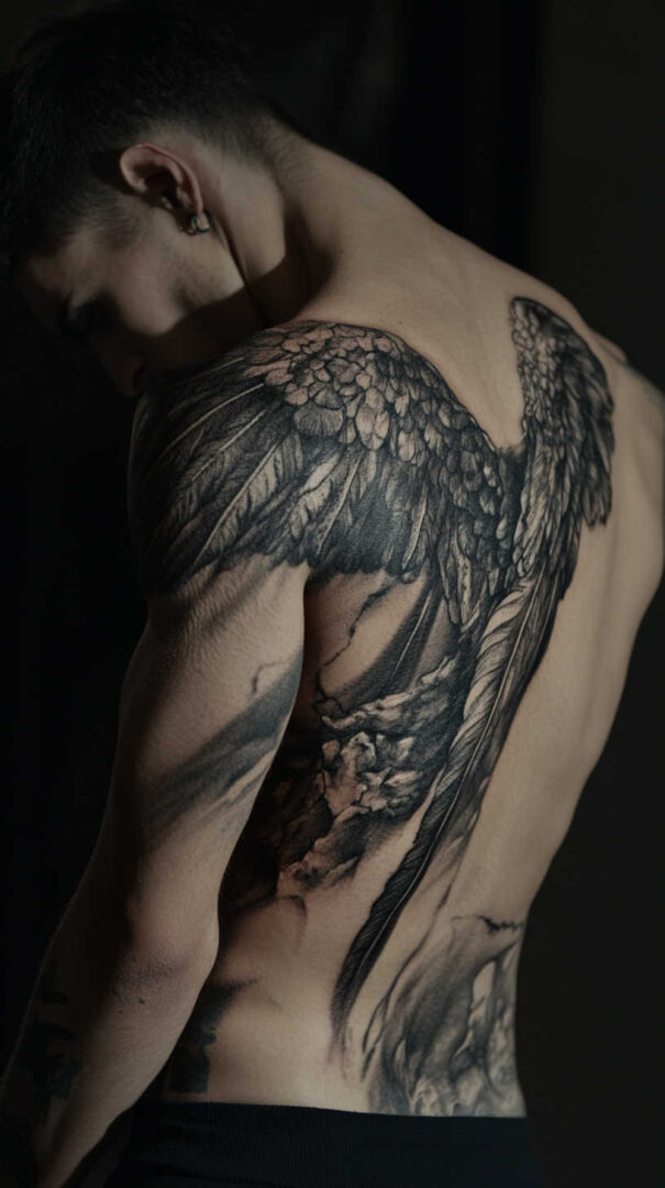 Symmetrical spread wings across the back or chest represent freedom, spiritual elevation, or protection from behind. Detailed feather work ranges from realistic layered plumage to stylized geometric forms.