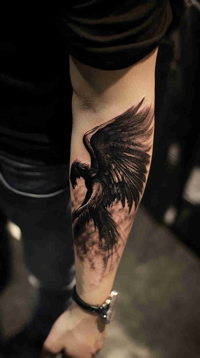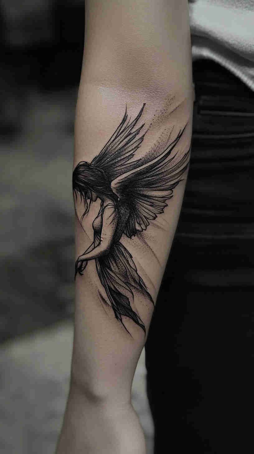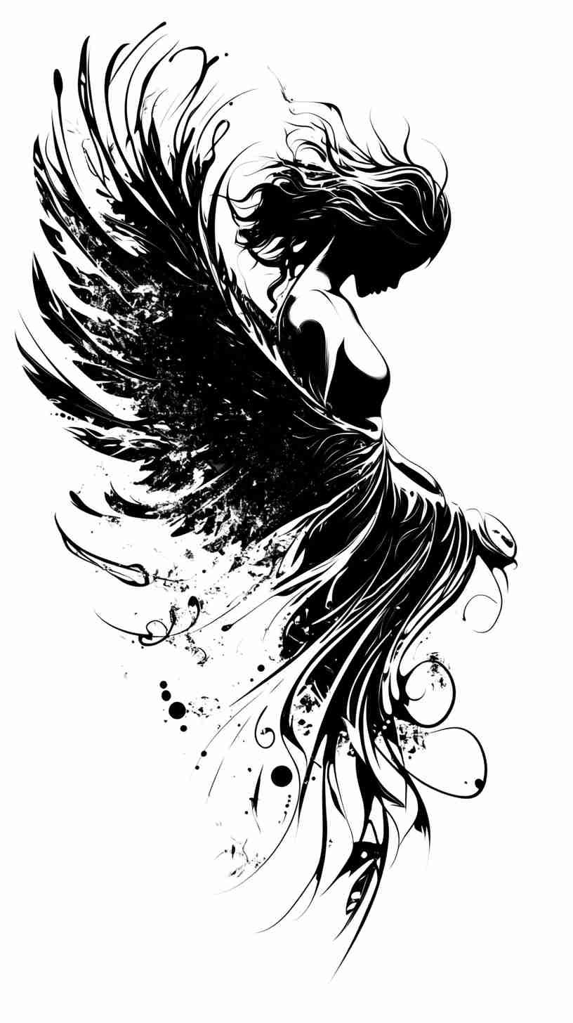 - Dramatic fallen angel designs with dark wings, subtle tears, and powerful expressions – representing resilience, transformation, and embracing shadow sides.