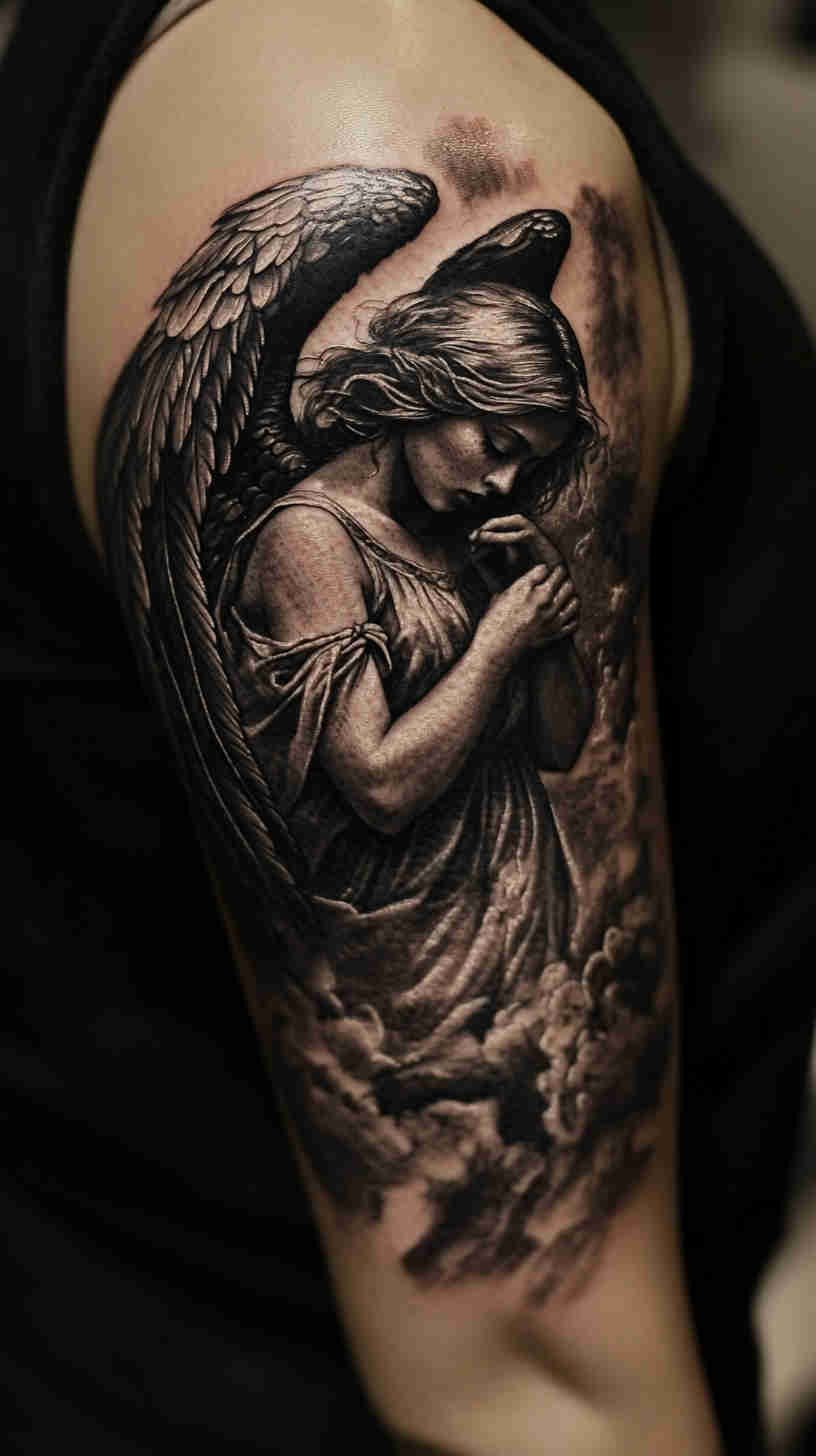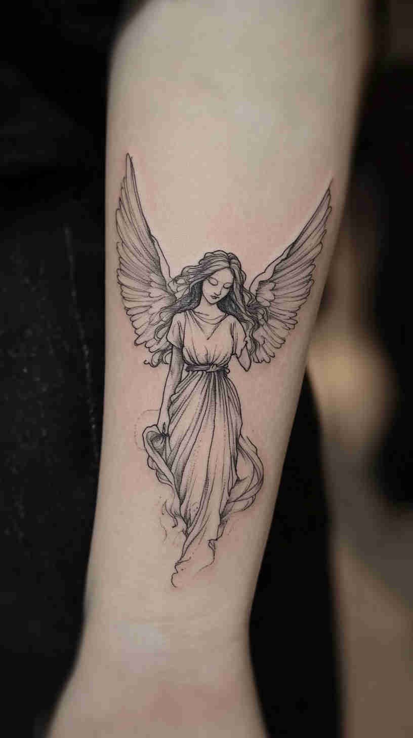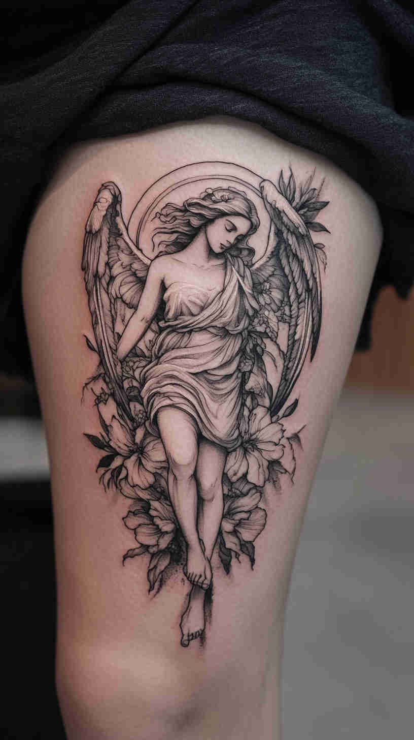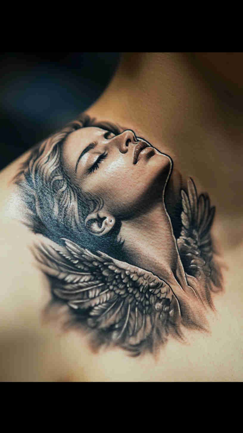 Social media glows with delicate angel wing placements on back, ribs, and ankles; realistic portrait-style guardian angels on forearms and thighs; minimalist linework halos and feathers; and dramatic full-sleeve compositions blending celestial figures with florals or geometric elements. Female tattoo artists have brought fresh sensitivity to the genre – softer shading, ethereal glows, feminine facial features, and empowering interpretations that move beyond traditional religious iconography.