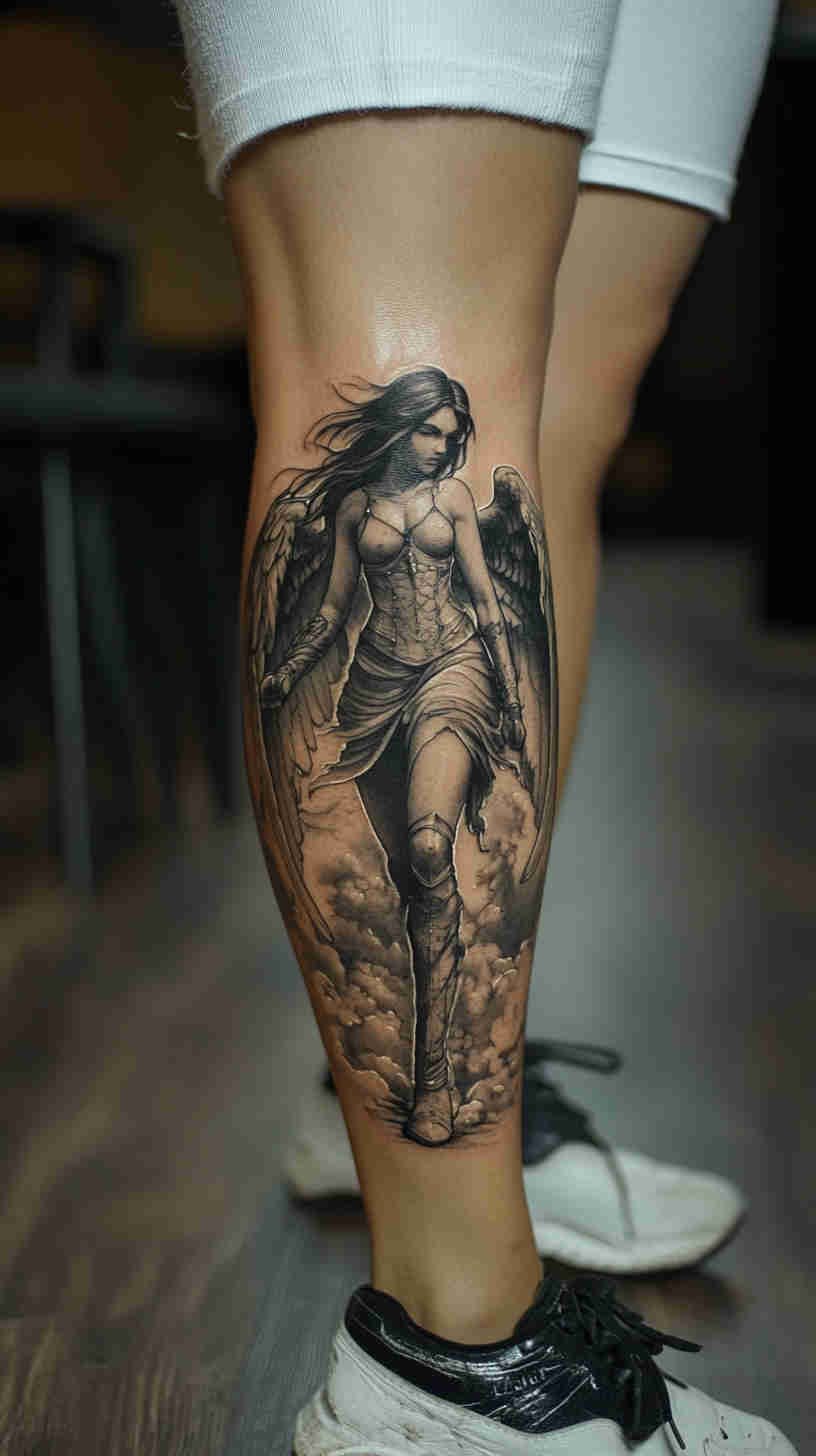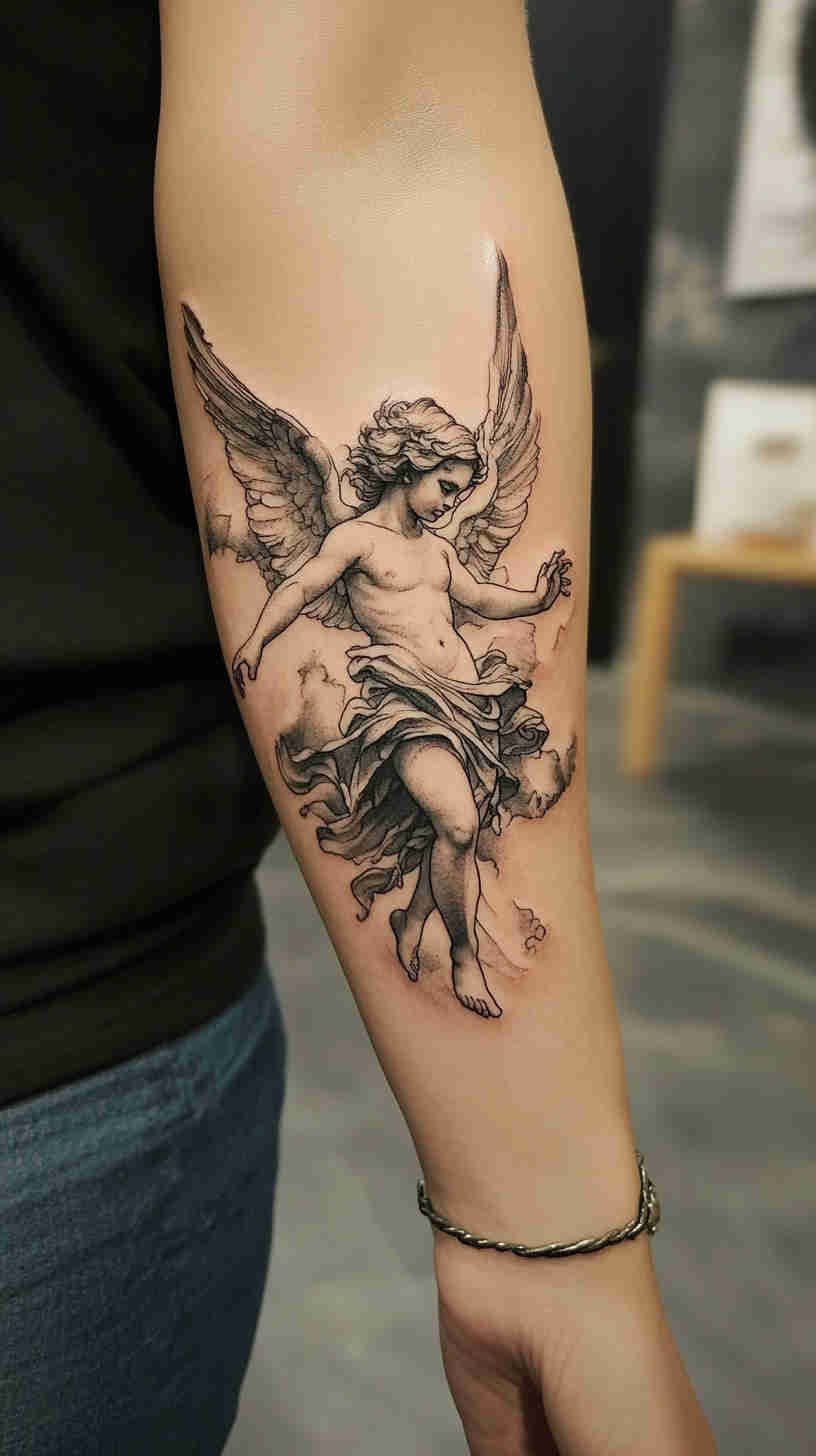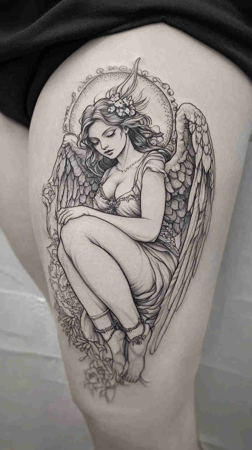 Social media glows with delicate angel wing placements on back, ribs, and ankles; realistic portrait-style guardian angels on forearms and thighs; minimalist linework halos and feathers; and dramatic full-sleeve compositions blending celestial figures with florals or geometric elements. Female tattoo artists have brought fresh sensitivity to the genre – softer shading, ethereal glows, feminine facial features, and empowering interpretations that move beyond traditional religious iconography.
