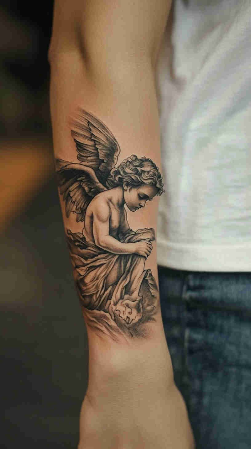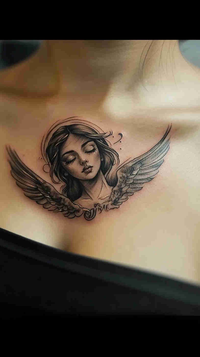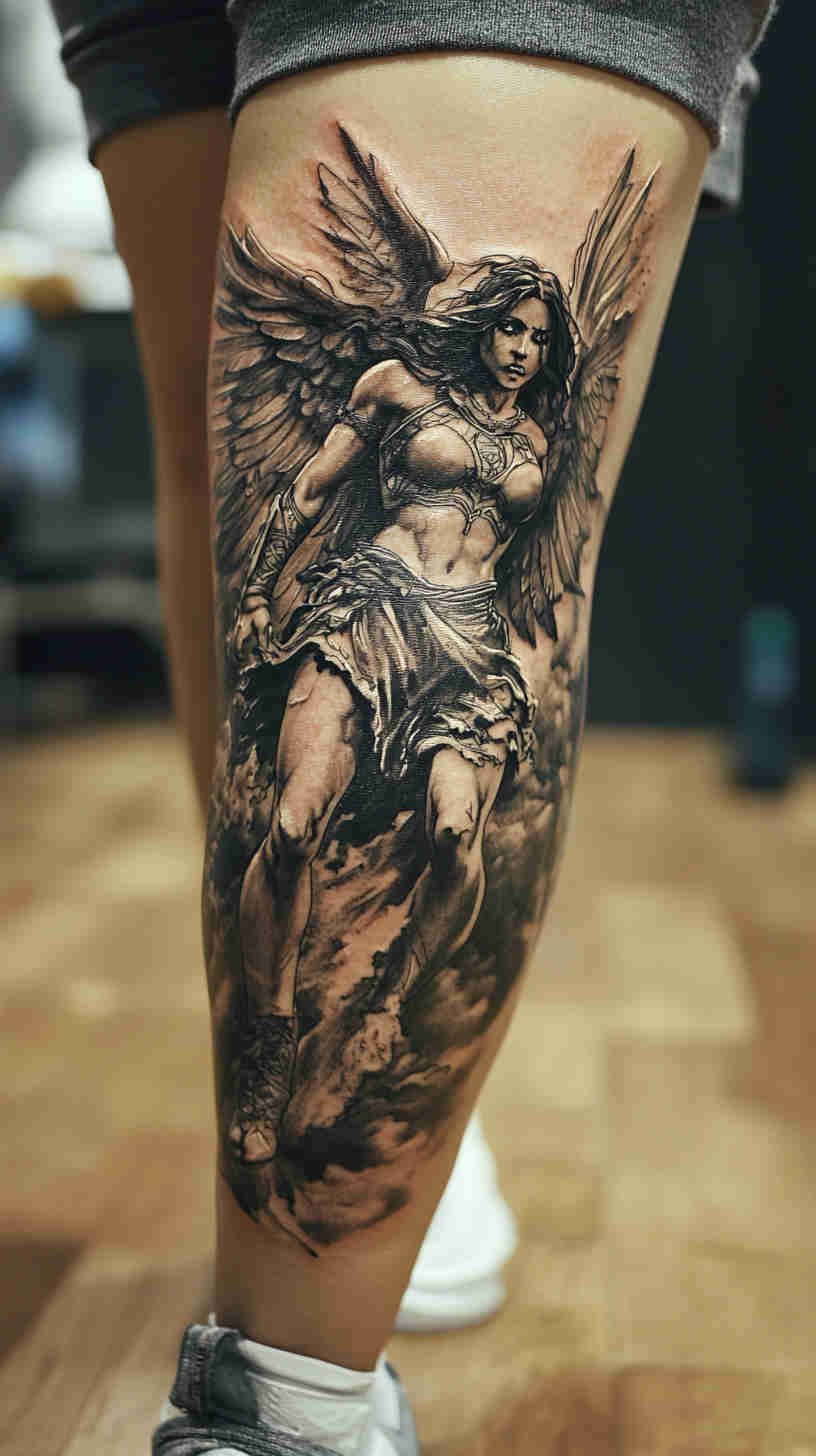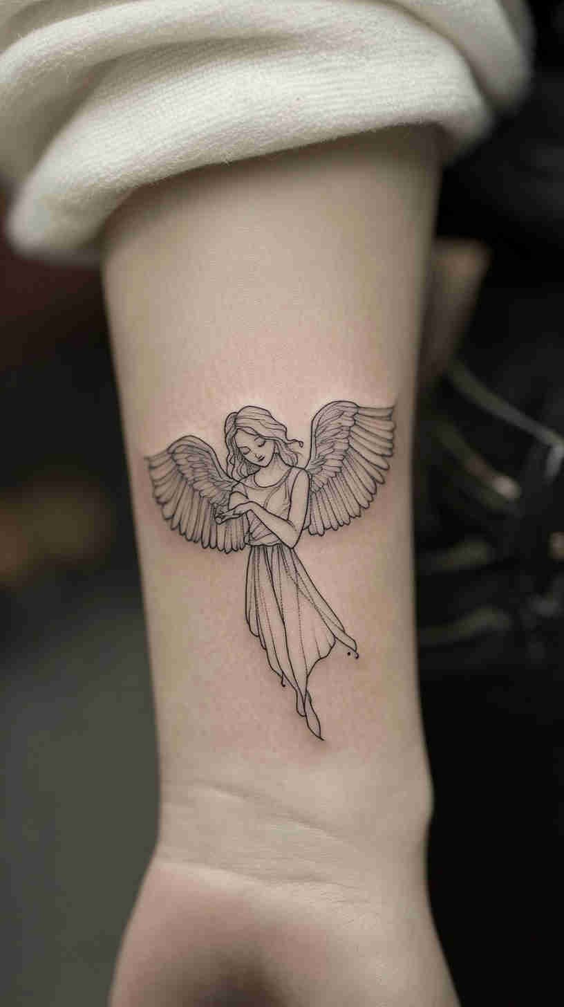 Social media glows with delicate angel wing placements on back, ribs, and ankles; realistic portrait-style guardian angels on forearms and thighs; minimalist linework halos and feathers; and dramatic full-sleeve compositions blending celestial figures with florals or geometric elements. Female tattoo artists have brought fresh sensitivity to the genre – softer shading, ethereal glows, feminine facial features, and empowering interpretations that move beyond traditional religious iconography.