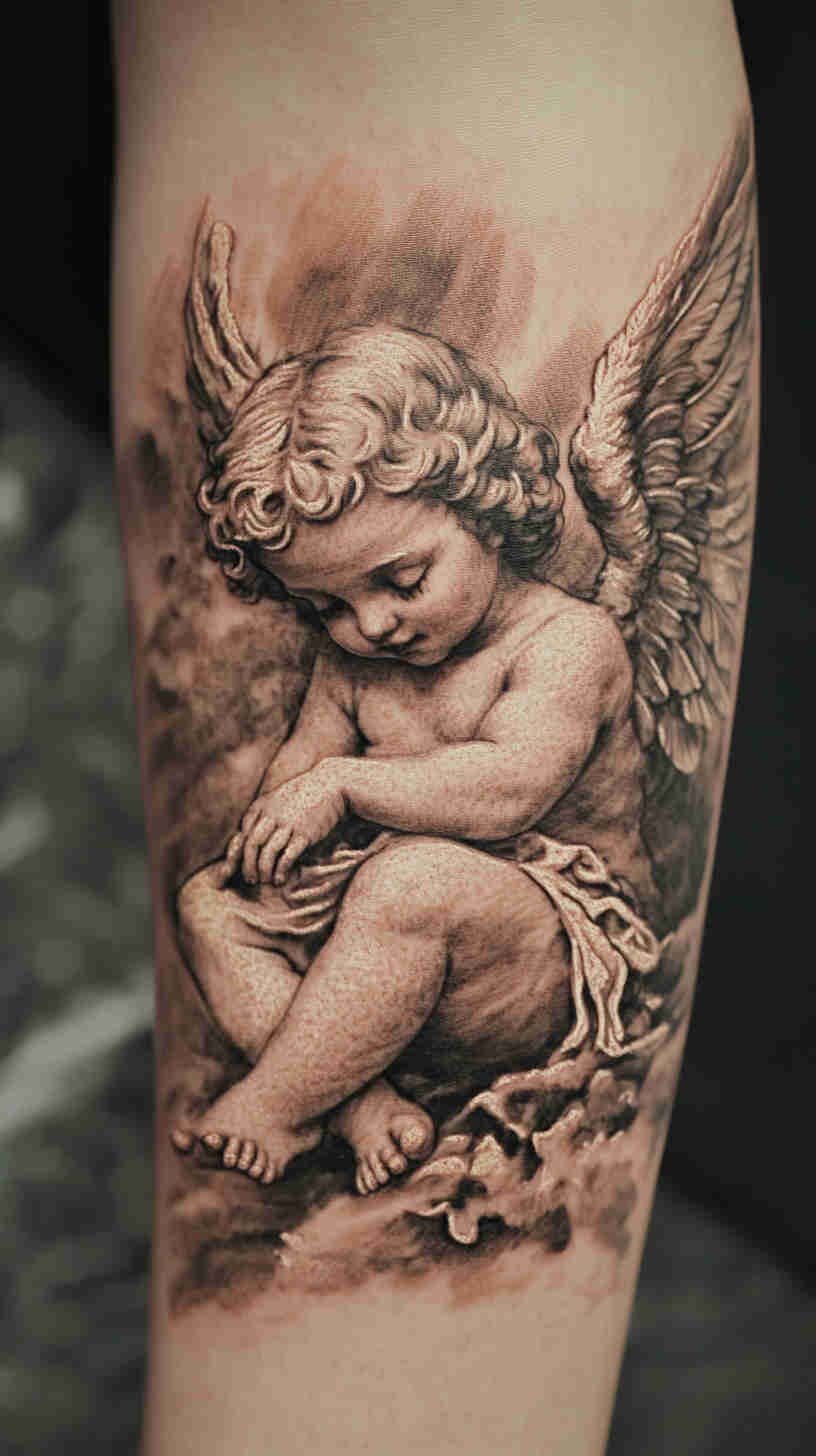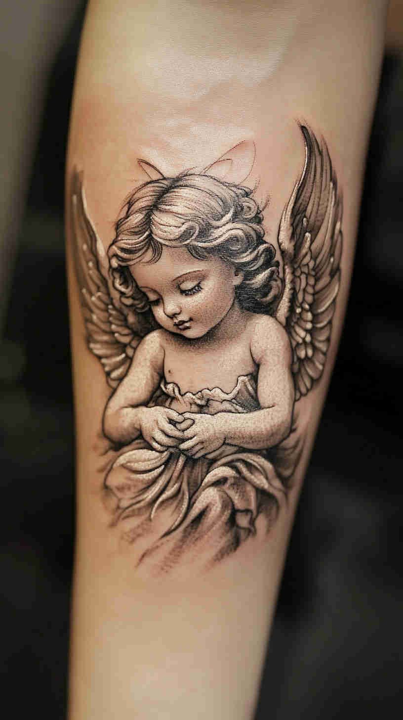 - Symbolic cherub and halo motifs in soft watercolor or fine-line styles – innocent yet sophisticated, ideal for collarbones, sternum, or small memorial pieces.