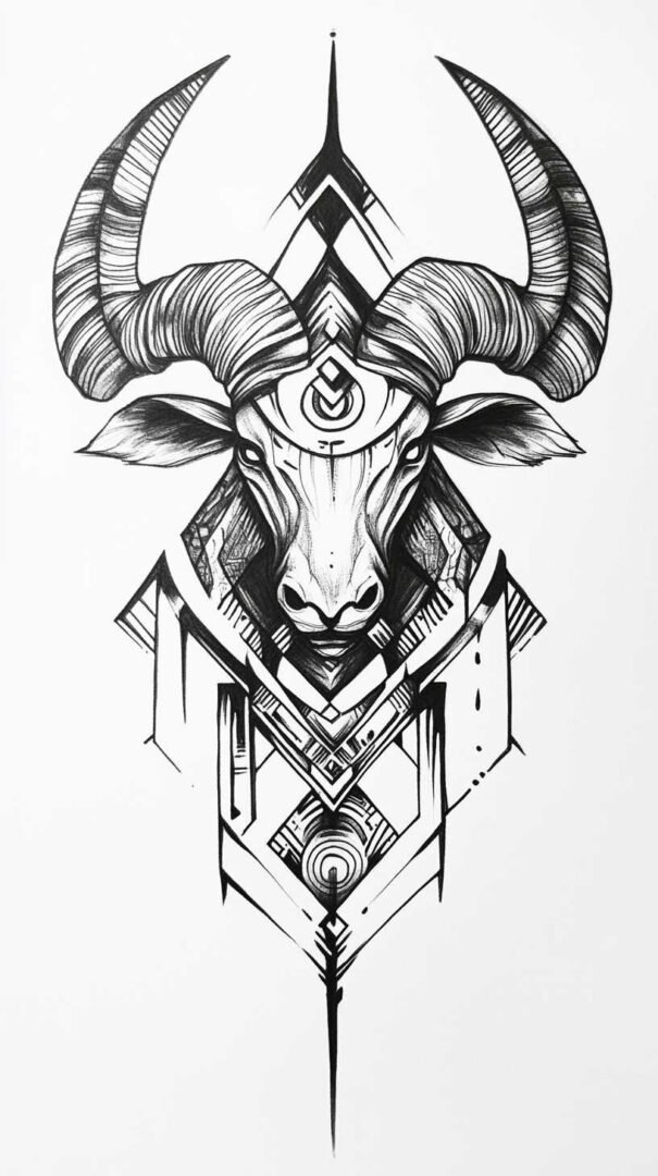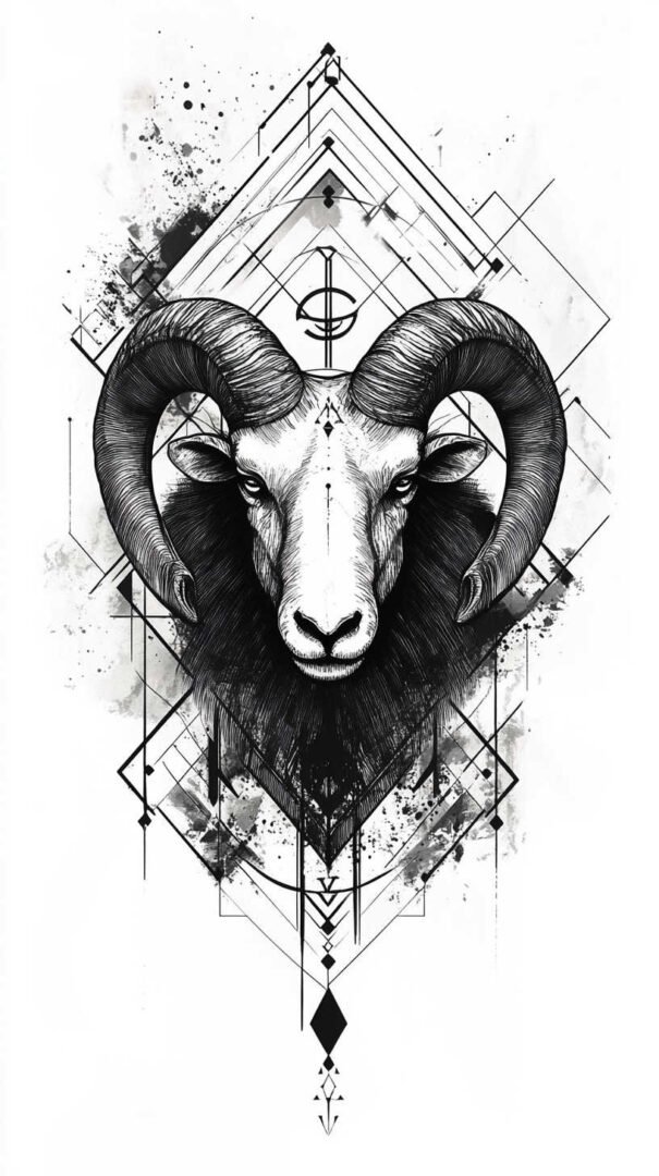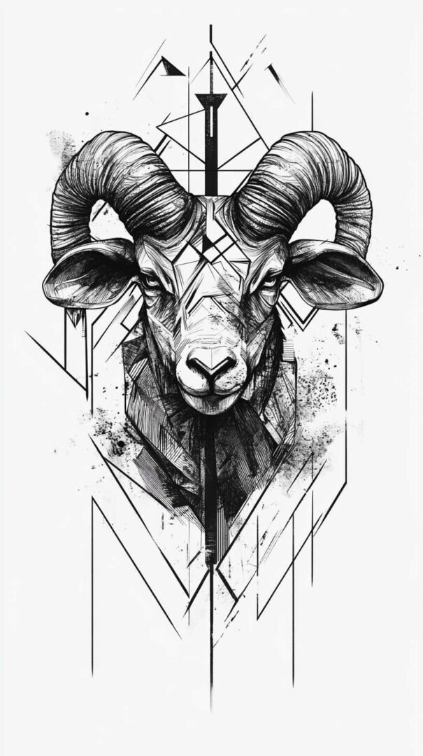 Geometric tattoos break the ram or glyph into triangles, lines, and polygons, creating a modern, almost architectural feel. Interlocking shapes form the horns or full ram silhouette, often with symmetry for balance.