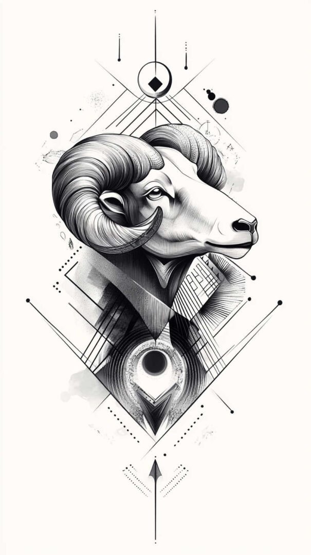 The most classic Aries tattoo features a detailed ram’s head, often in profile to highlight the powerful curved horns. Realistic styles use fine shading, texture for fur, and intense eye detail to convey the ram’s fierce gaze and unstoppable charge.