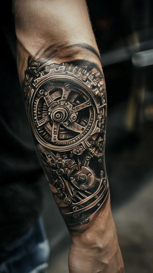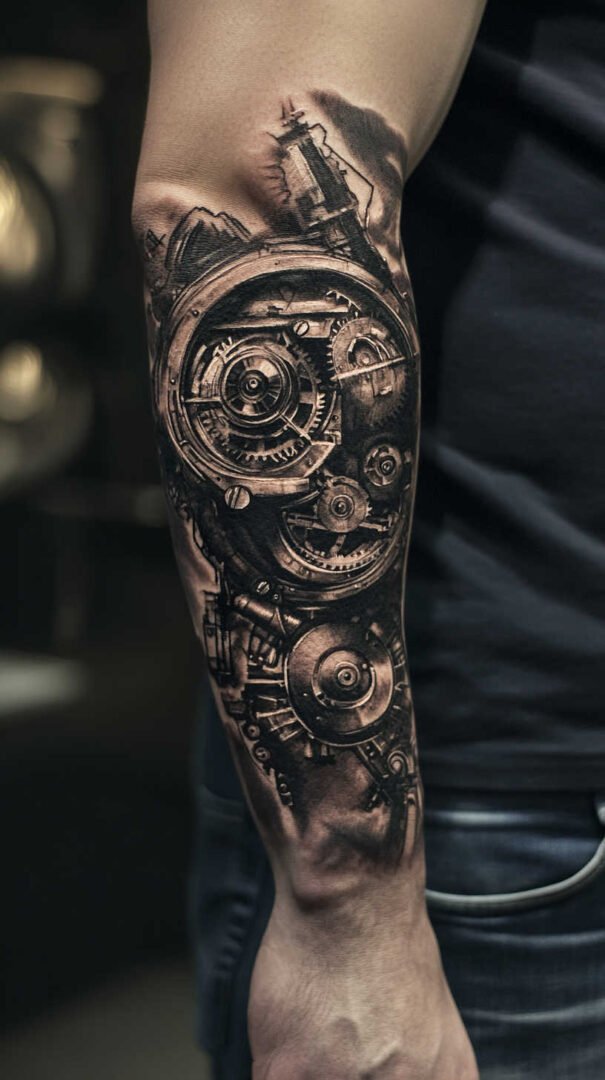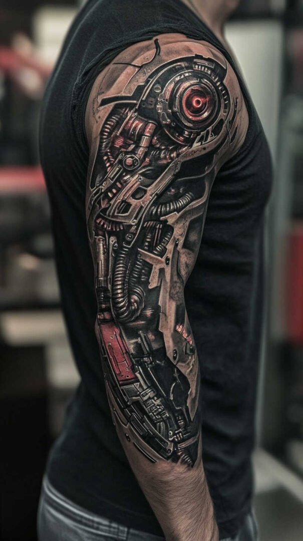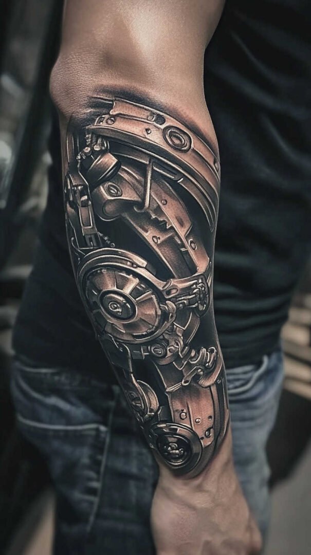 - Biomechanical Elements: For a futuristic vibe, biomechanical tattoos blend organic flesh with mechanical parts, like gears and circuits emerging from the skin. HD rendering makes the metallic textures gleam and the illusions seamless, perfect for men who appreciate sci-fi or industrial aesthetics.