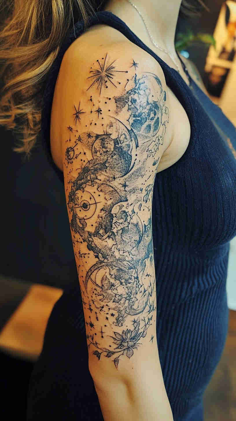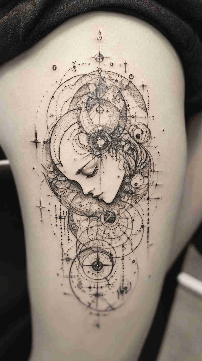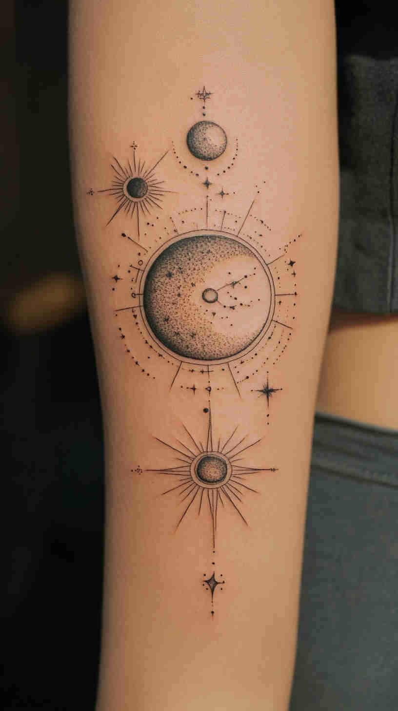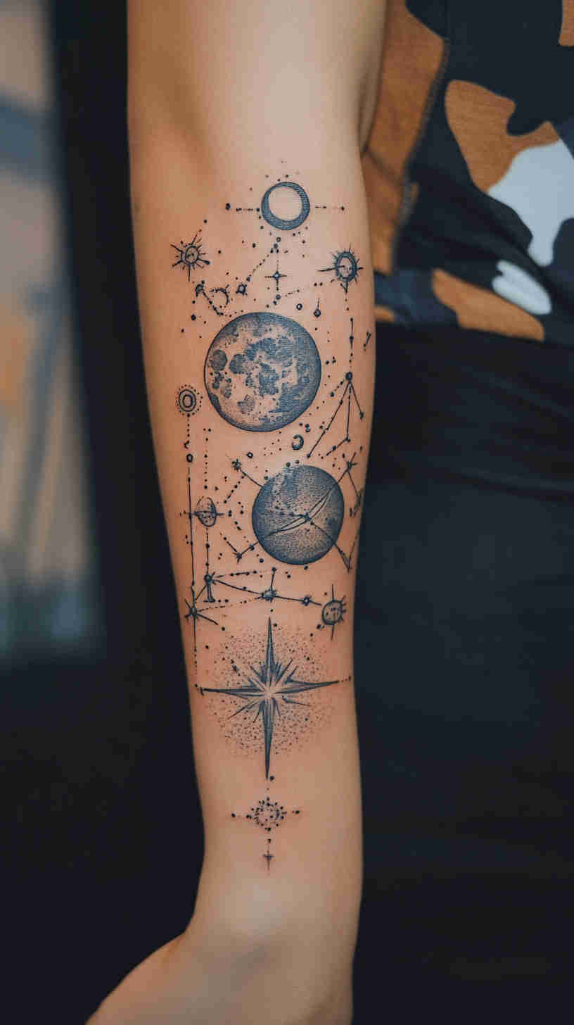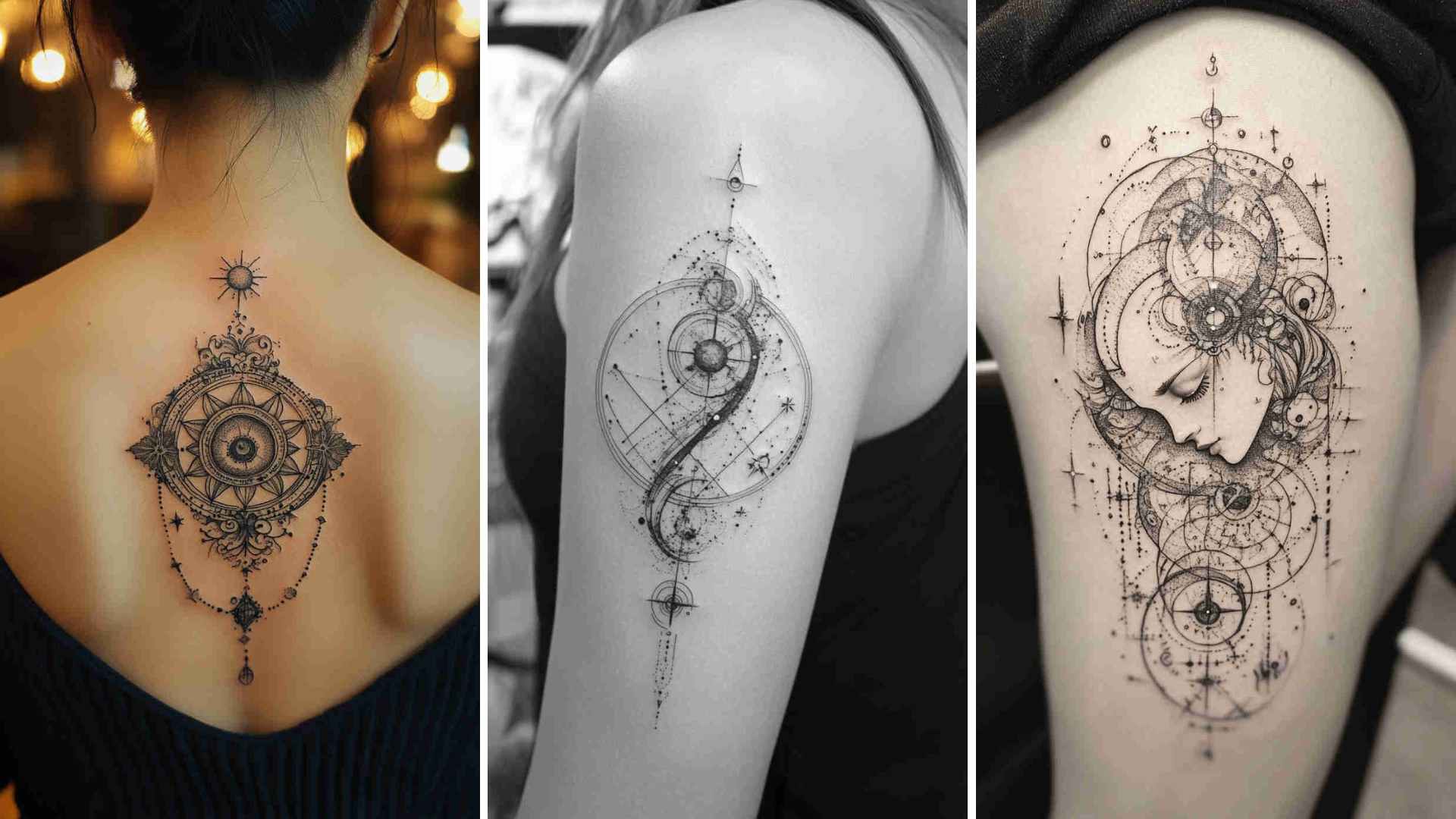 Social feeds shimmer with constellation maps wrapping wrists and ankles, minimalist zodiac glyphs on collarbones and fingers, watercolor birth chart elements blending planets and houses, realistic planetary portraits (especially Moon and Venus), fine-line horoscope symbols forming elegant bracelets, and large-scale cosmic sleeves merging multiple signs with galaxies, phases, and sacred geometry. Female tattoo artists have brought fresh elegance to the genre – softer palettes, feminine curves in linework, empowering planetary personifications, and delicate dotwork star fields.