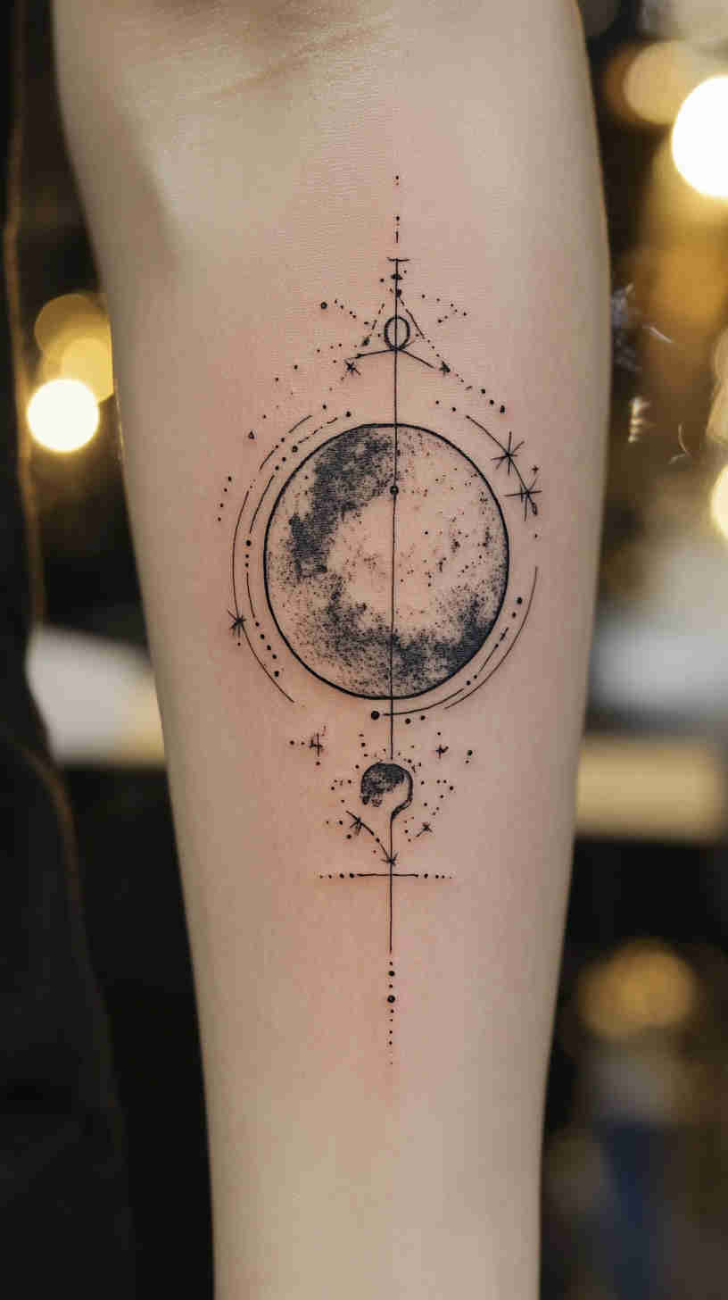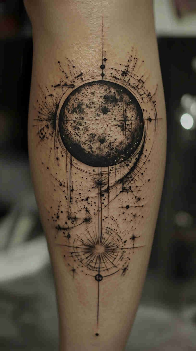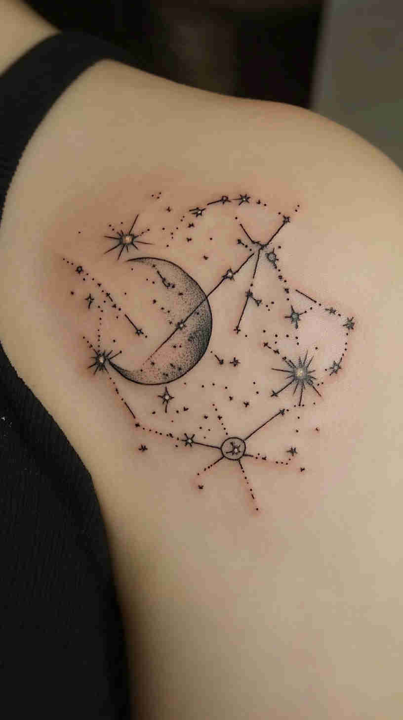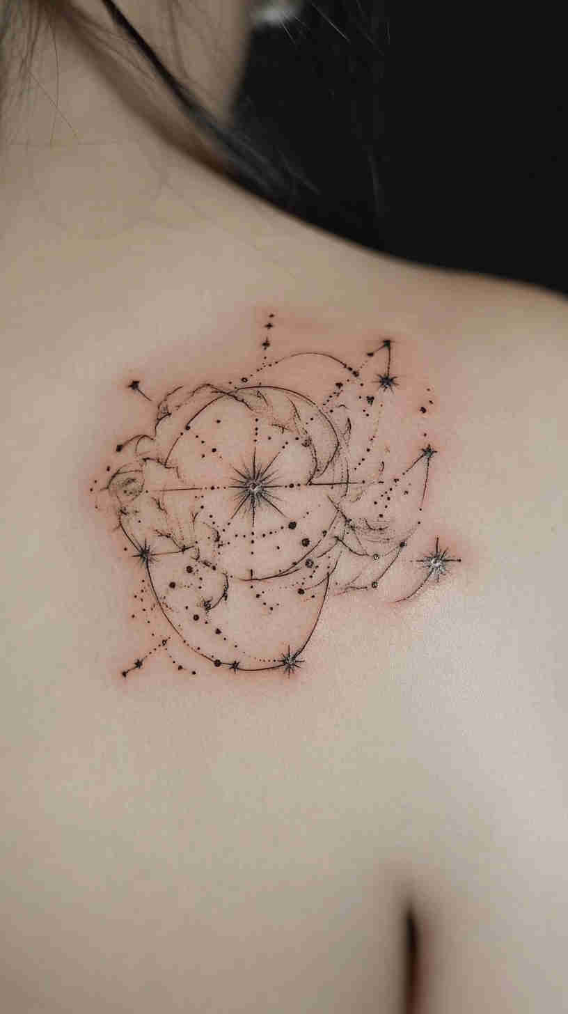 Social feeds shimmer with constellation maps wrapping wrists and ankles, minimalist zodiac glyphs on collarbones and fingers, watercolor birth chart elements blending planets and houses, realistic planetary portraits (especially Moon and Venus), fine-line horoscope symbols forming elegant bracelets, and large-scale cosmic sleeves merging multiple signs with galaxies, phases, and sacred geometry. Female tattoo artists have brought fresh elegance to the genre – softer palettes, feminine curves in linework, empowering planetary personifications, and delicate dotwork star fields.