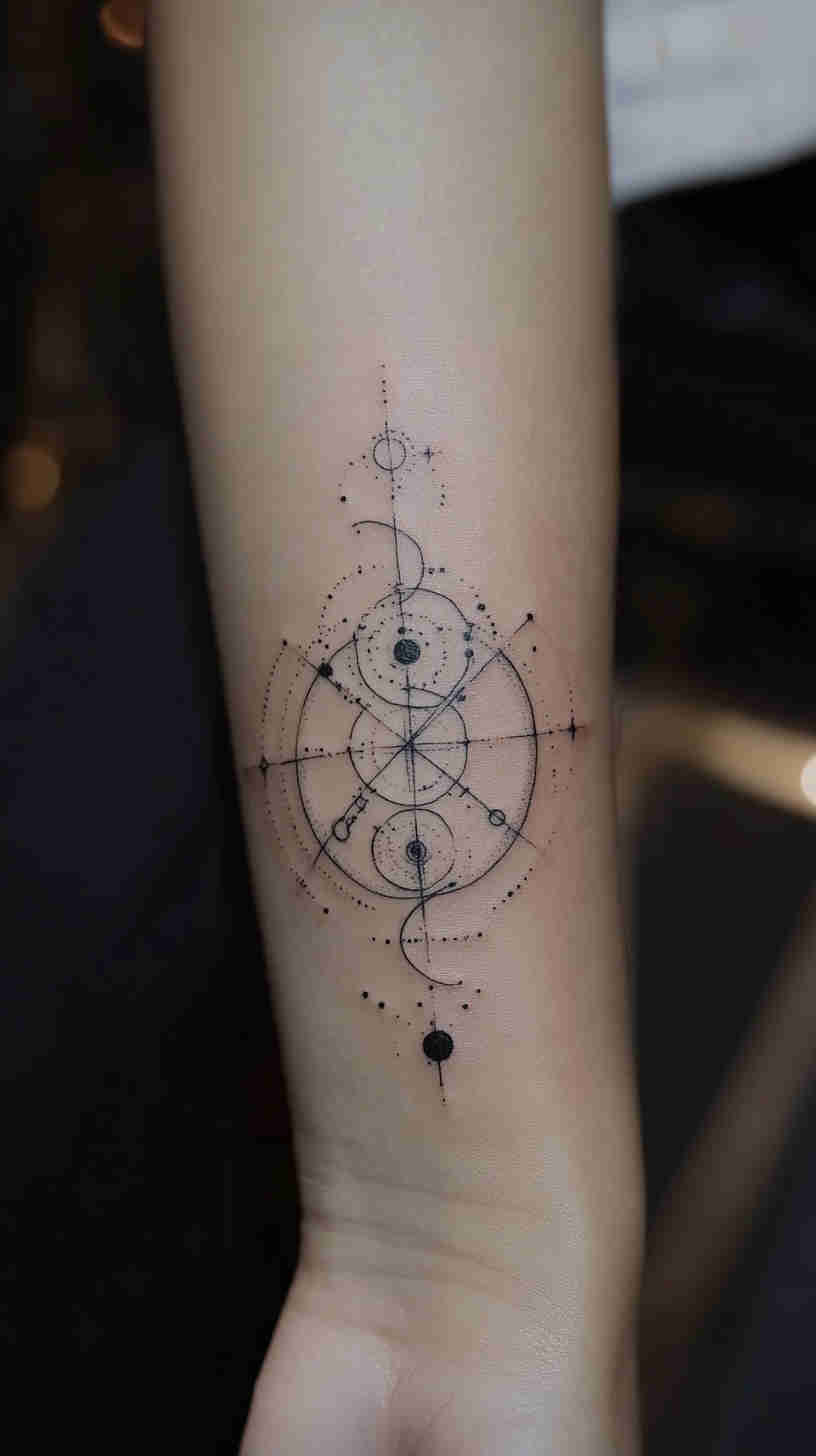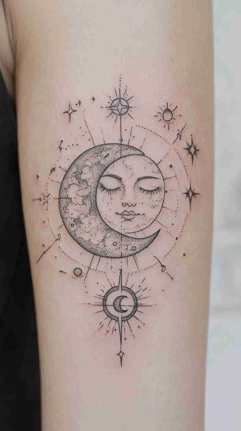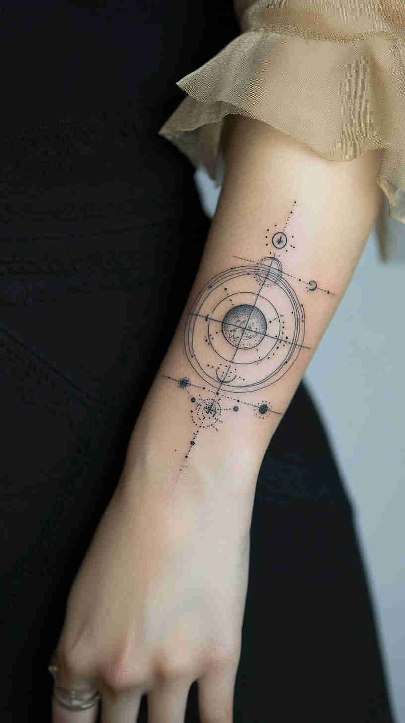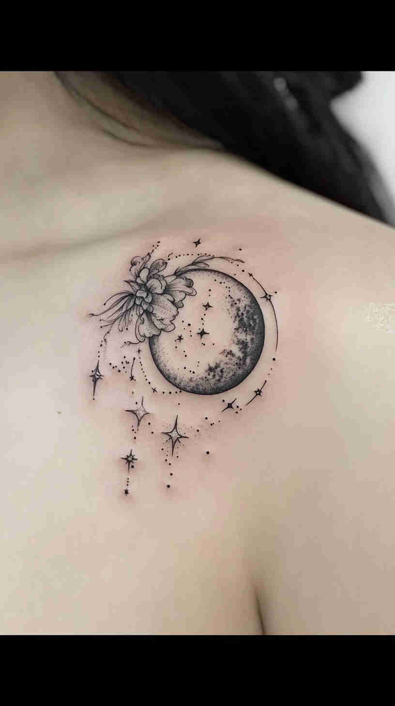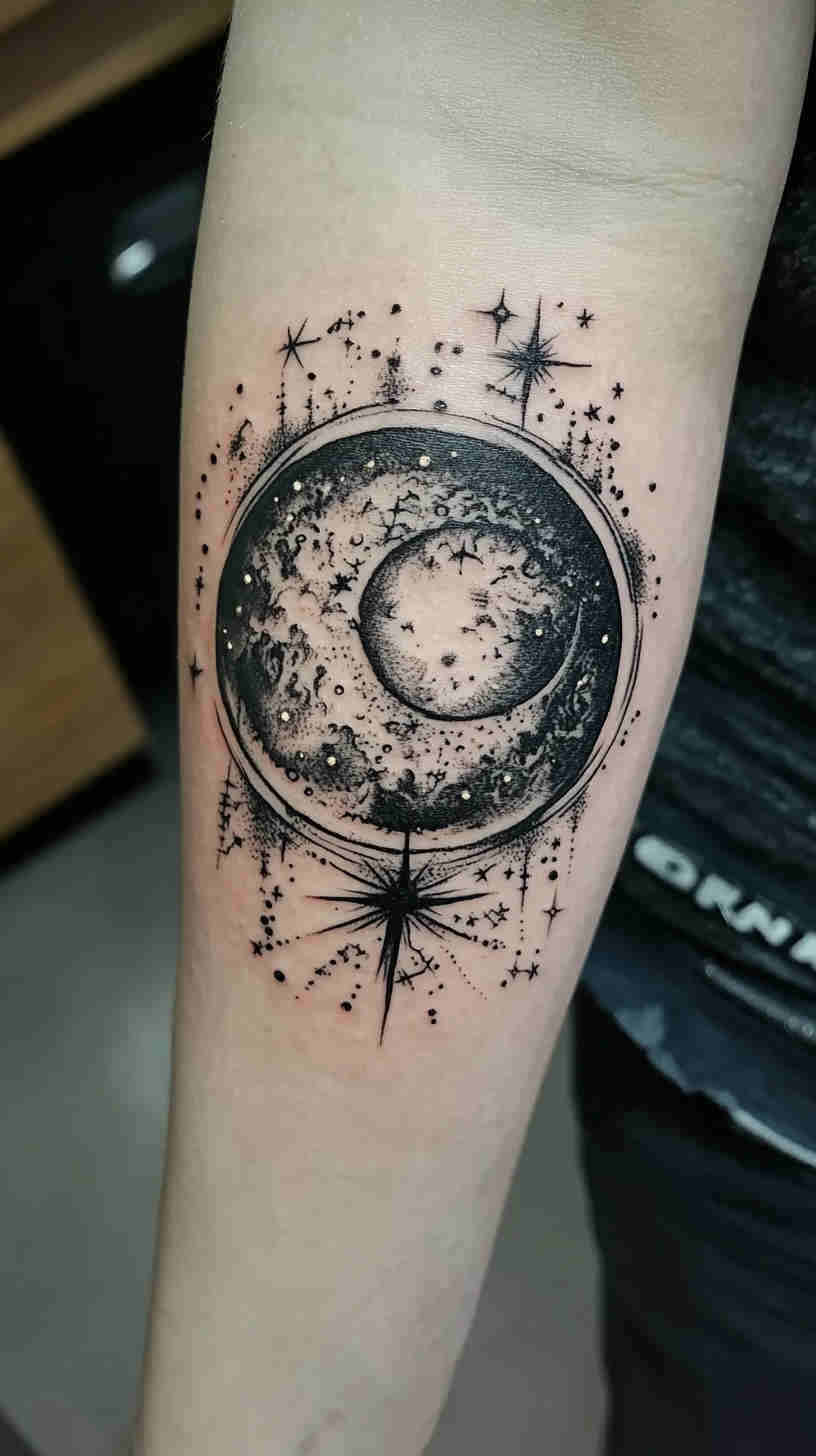Social feeds shimmer with constellation maps wrapping wrists and ankles, minimalist zodiac glyphs on collarbones and fingers, watercolor birth chart elements blending planets and houses, realistic planetary portraits (especially Moon and Venus), fine-line horoscope symbols forming elegant bracelets, and large-scale cosmic sleeves merging multiple signs with galaxies, phases, and sacred geometry. Female tattoo artists have brought fresh elegance to the genre – softer palettes, feminine curves in linework, empowering planetary personifications, and delicate dotwork star fields.