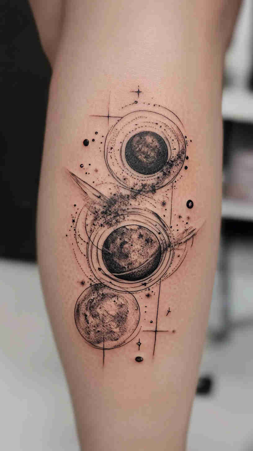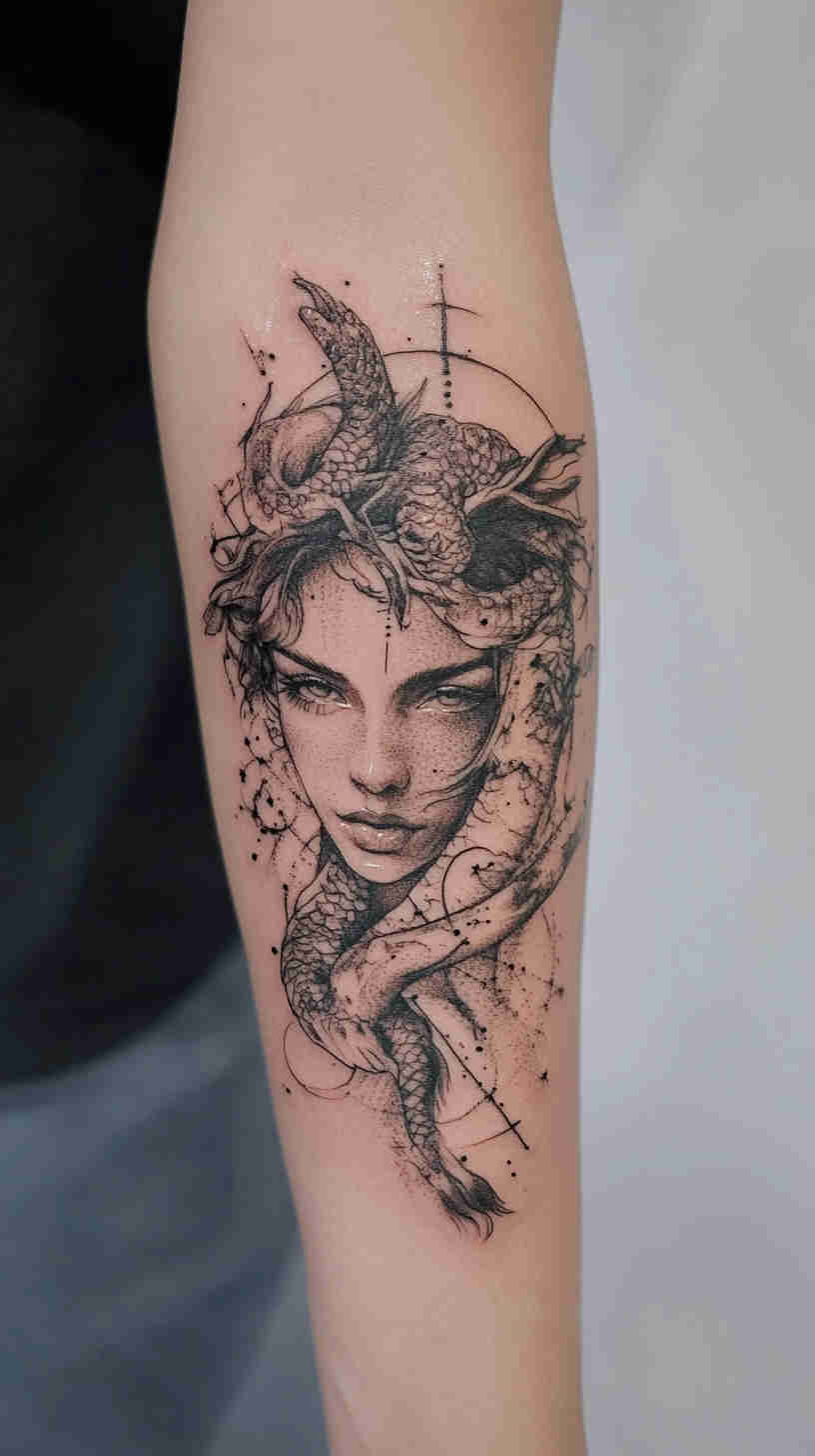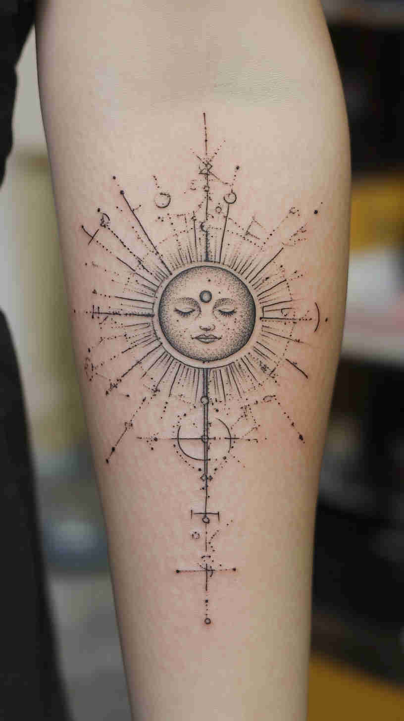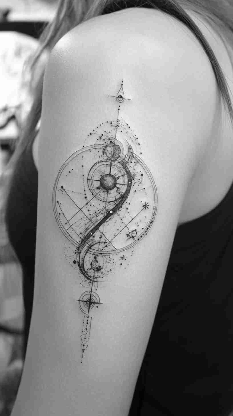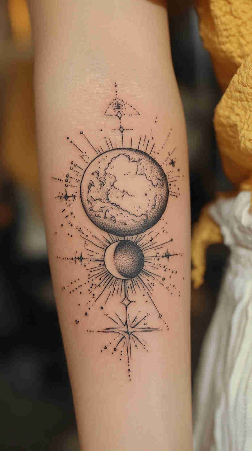 Social feeds shimmer with constellation maps wrapping wrists and ankles, minimalist zodiac glyphs on collarbones and fingers, watercolor birth chart elements blending planets and houses, realistic planetary portraits (especially Moon and Venus), fine-line horoscope symbols forming elegant bracelets, and large-scale cosmic sleeves merging multiple signs with galaxies, phases, and sacred geometry. Female tattoo artists have brought fresh elegance to the genre – softer palettes, feminine curves in linework, empowering planetary personifications, and delicate dotwork star fields.