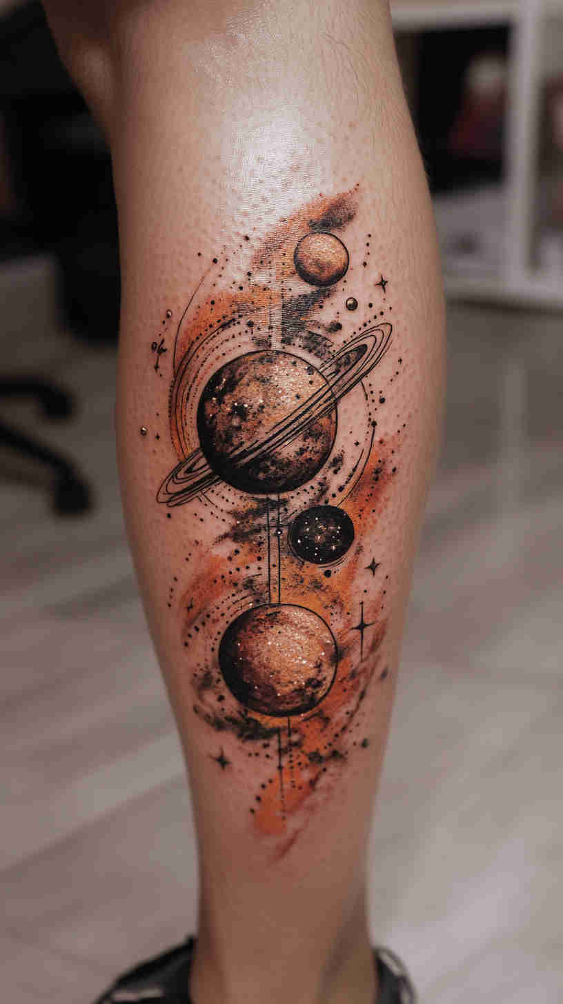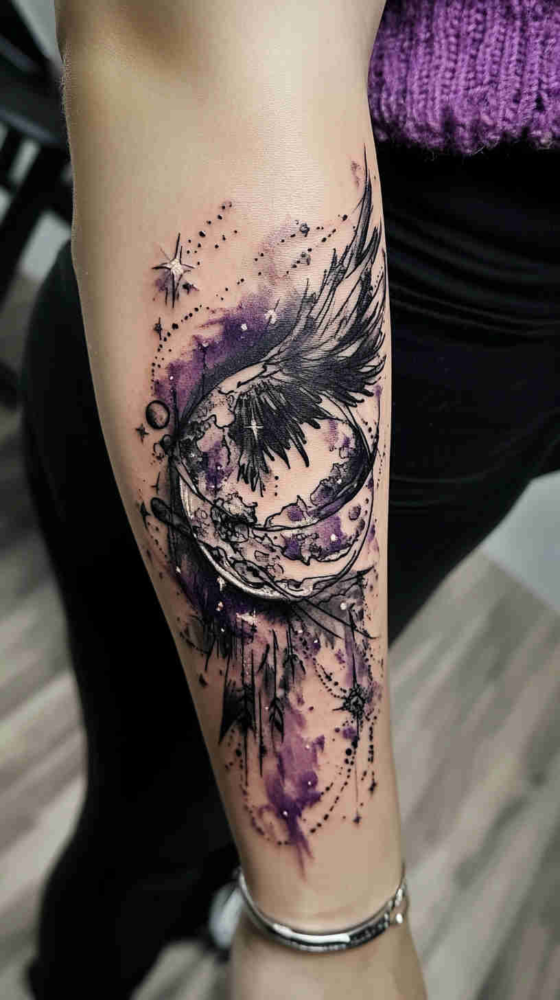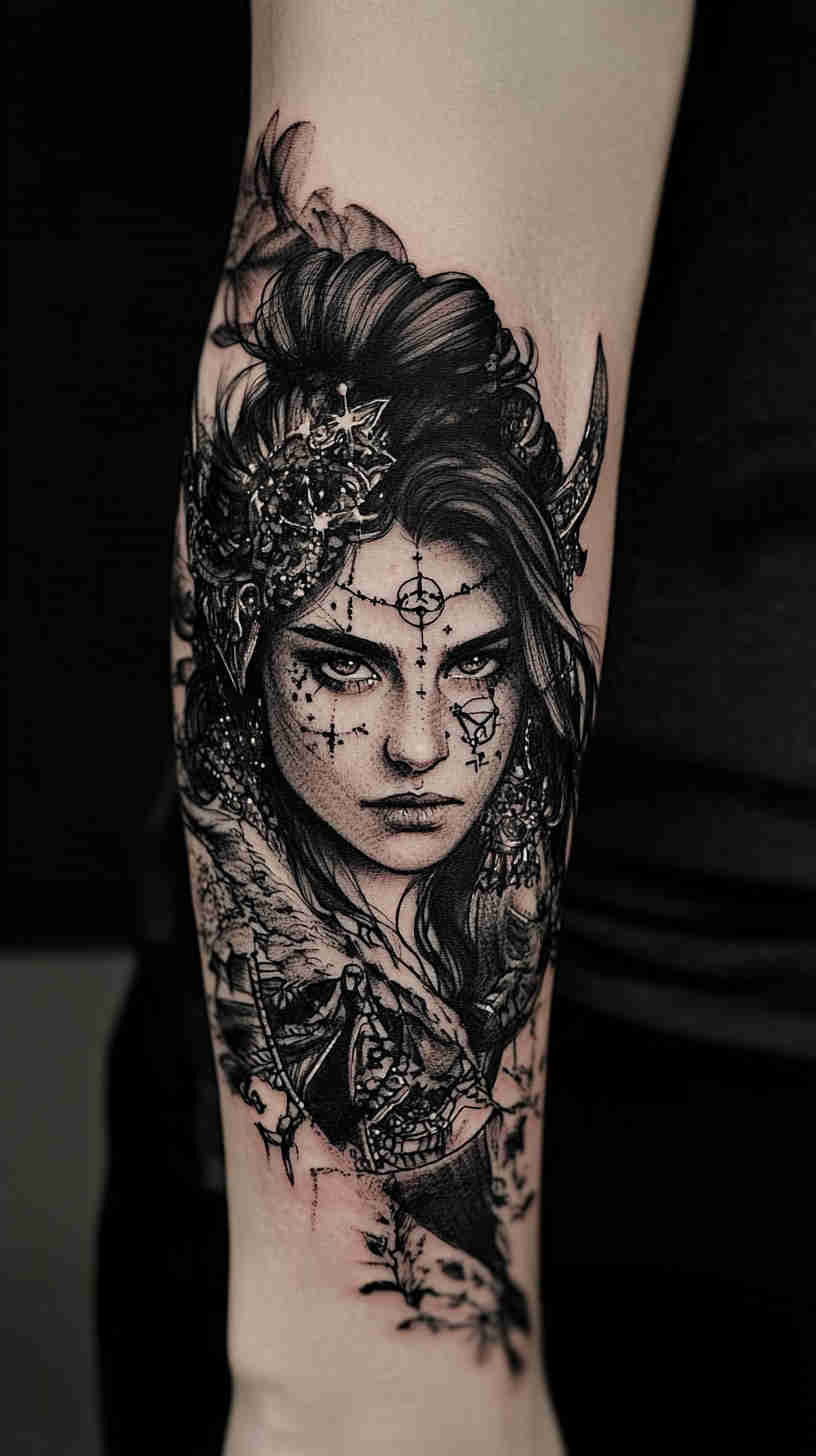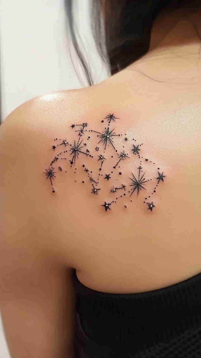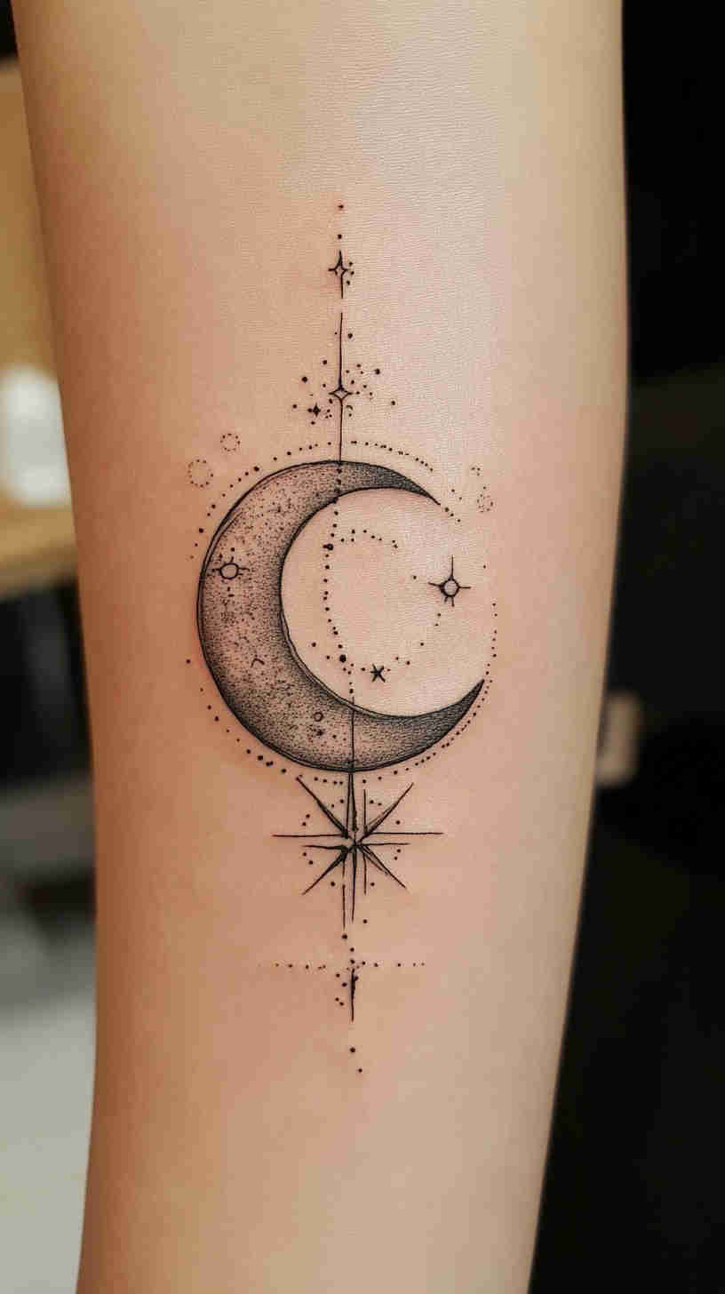 Social feeds shimmer with constellation maps wrapping wrists and ankles, minimalist zodiac glyphs on collarbones and fingers, watercolor birth chart elements blending planets and houses, realistic planetary portraits (especially Moon and Venus), fine-line horoscope symbols forming elegant bracelets, and large-scale cosmic sleeves merging multiple signs with galaxies, phases, and sacred geometry. Female tattoo artists have brought fresh elegance to the genre – softer palettes, feminine curves in linework, empowering planetary personifications, and delicate dotwork star fields.