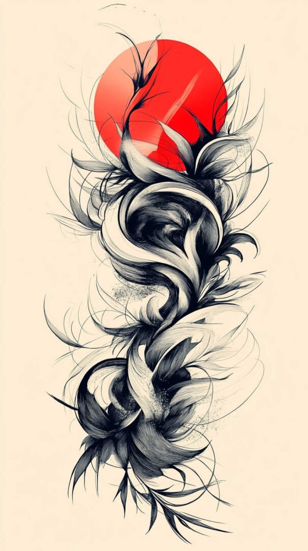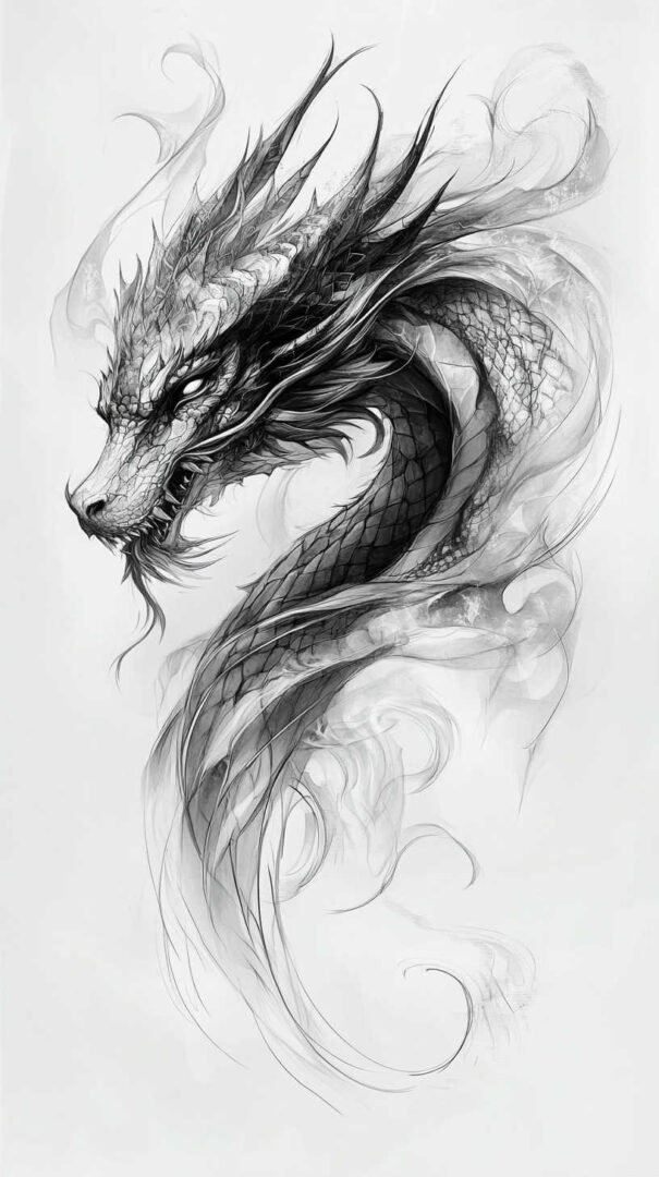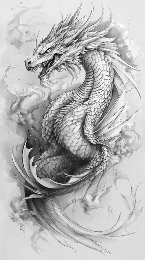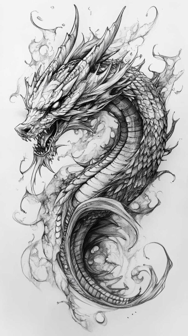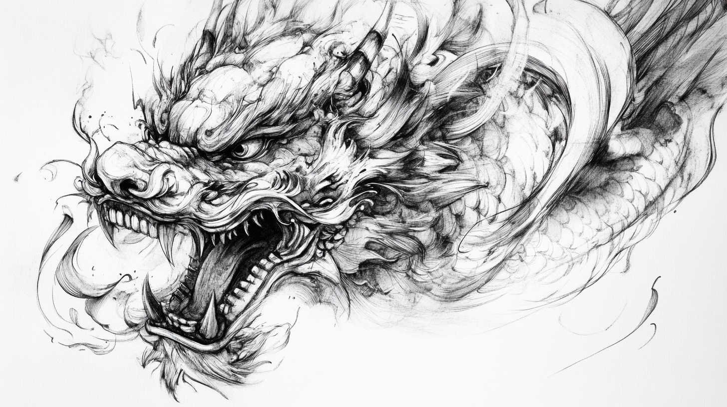 Japanese sketches, or Irezumi, feature flowing compositions with dragons coiling around koi fish, tigers amid cherry blossoms, or phoenixes in flames, symbolizing perseverance, good fortune, and power. Backgrounds incorporate waves, clouds, and wind bars for dynamic energy.