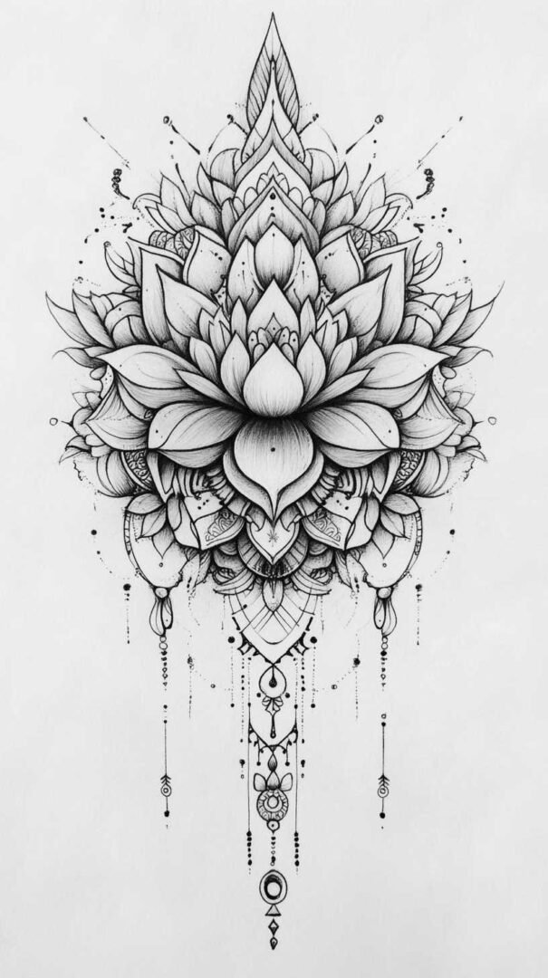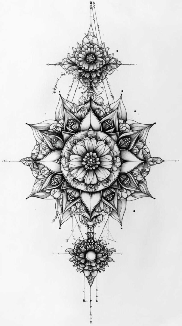 Blackwork sketches rely on solid black ink for bold, graphic impact, often filling large areas with patterns that create optical illusions or tribal-inspired depth. Geometric designs within this category use perfect symmetry, sacred shapes, and dotwork for textured effects.