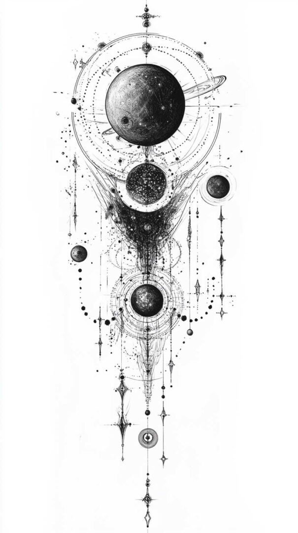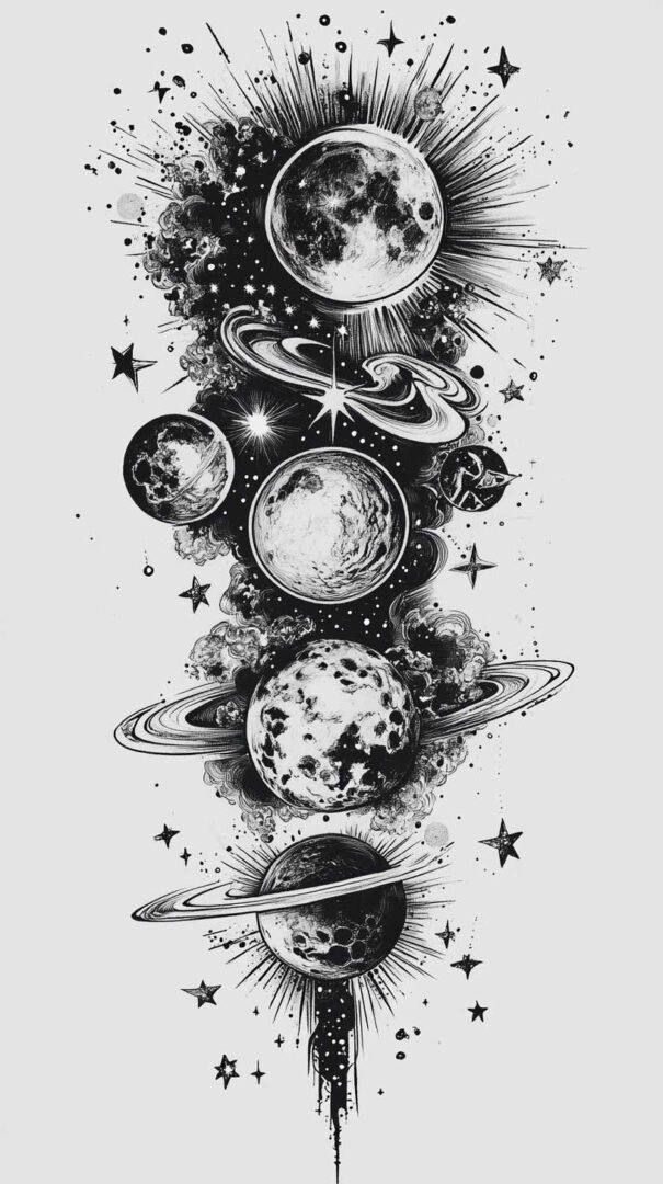- Celestial themes: Moons, stars, or cosmic voids integrated into dense black fields.