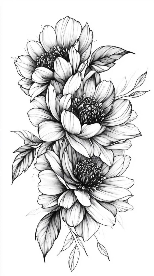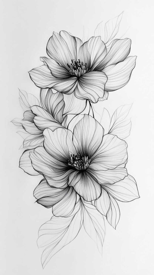 - Floral compositions: Roses, lotuses, or wild botanicals stylized with heavy black fills and delicate negative space outlines.