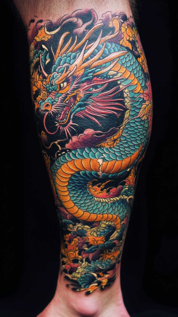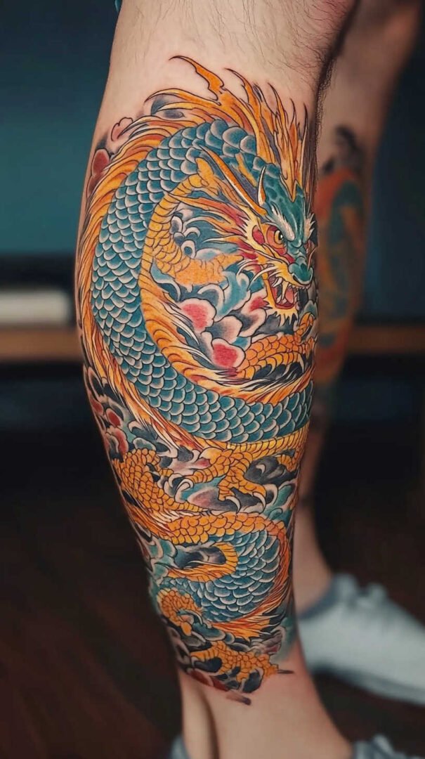 Japanese-inspired art features flowing dragons, koi fish, or waves rendered in rich detail. These designs use vibrant colors or traditional black-and-gray with red accents, wrapping elegantly around the leg for a narrative feel.