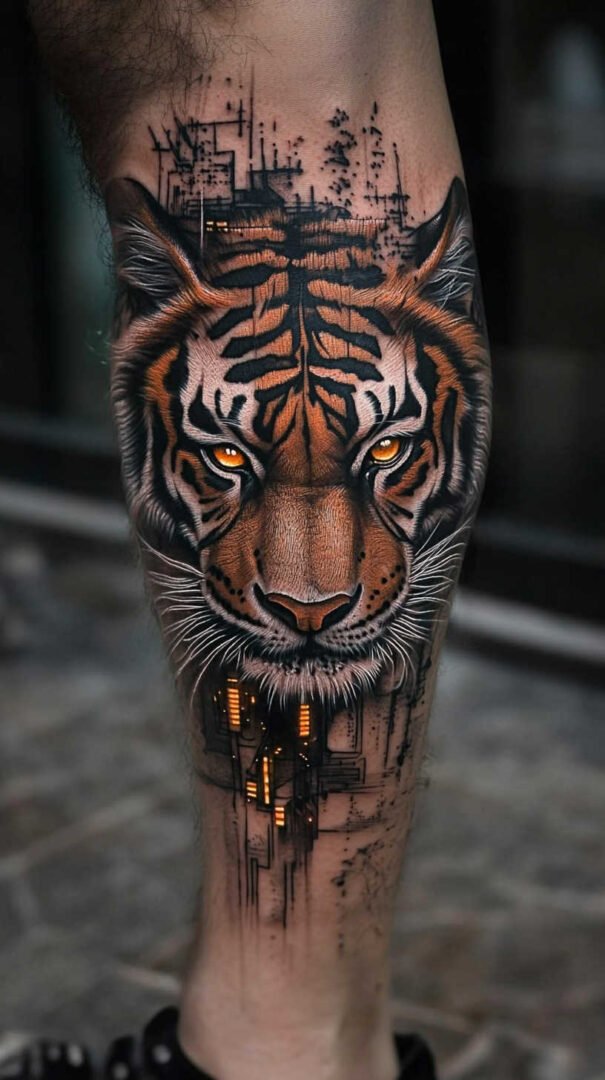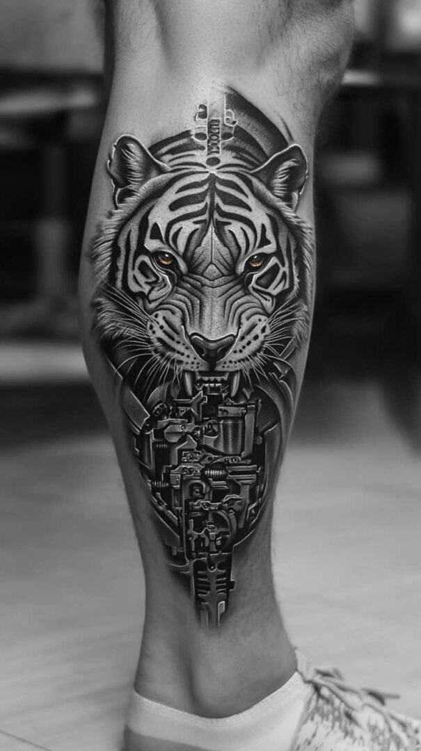 Biomechanical styles evoke a futuristic, mechanical fusion with the body. Gears, circuits, and metallic textures appear to emerge from beneath the skin, ideal for the calf’s rounded form where shading can mimic depth and movement.