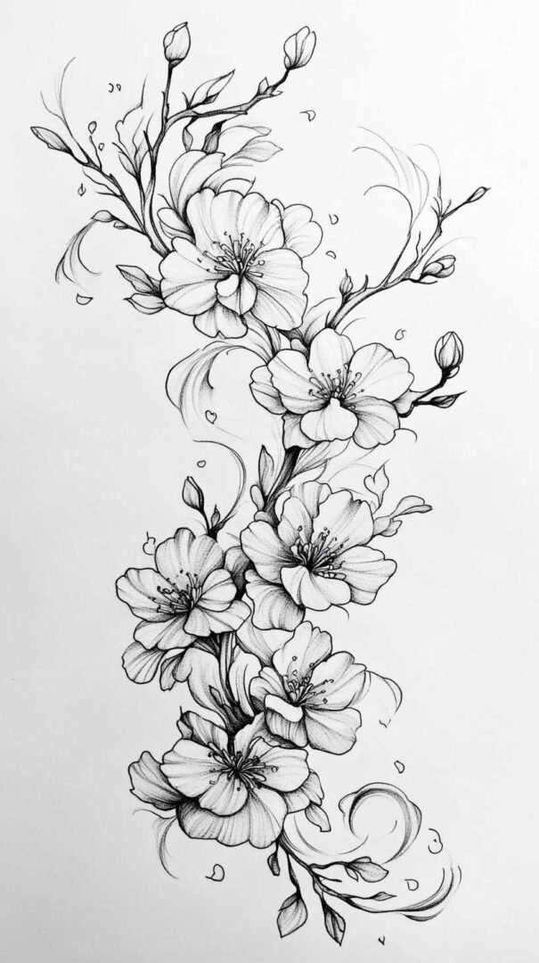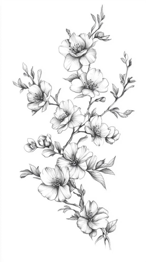 - Full Tree or Branch — A twisting branch with clustered blooms represents life’s journey—strong roots amid delicate flowers. Larger sketches incorporate twisting forms for dramatic effect.