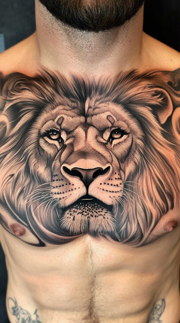 - Lion Designs: Lions symbolize bravery, leadership, and royalty. Sketches often depict roaring heads centered over the heart or full bodies sprawling across both pectorals, with manes flowing into surrounding elements like crowns or flames.