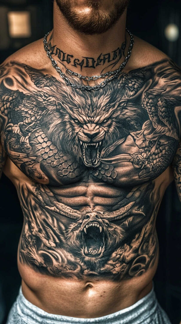 Animal designs dominate chest tattoos for men, embodying primal qualities like courage and independence. Detailed 4K renders highlight fur textures, scale patterns, and intense gazes.
