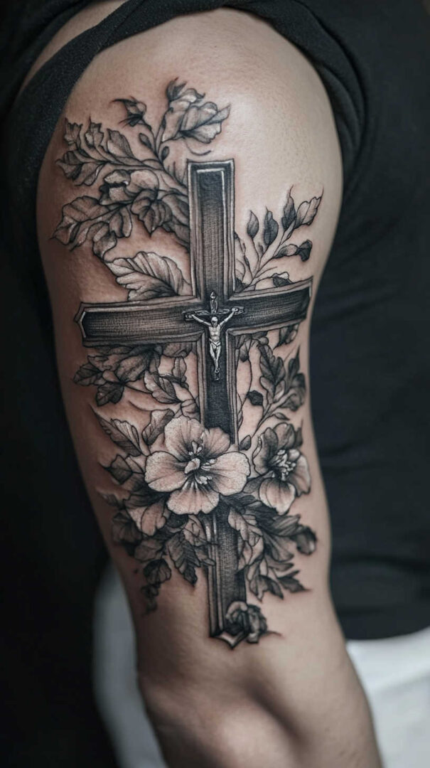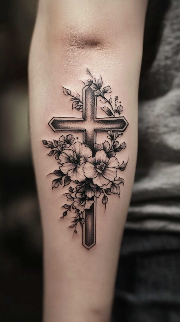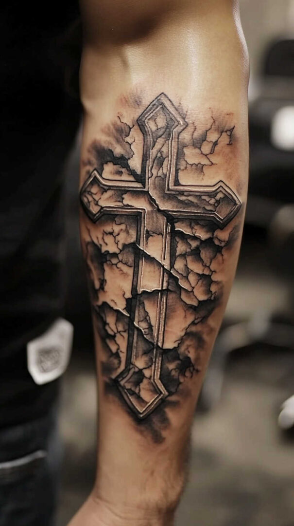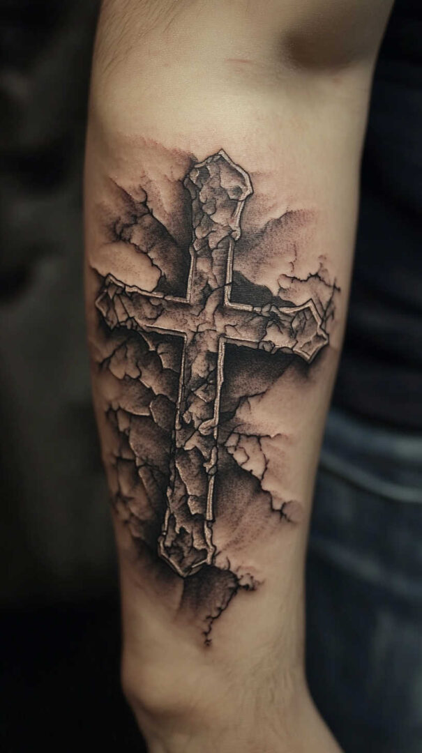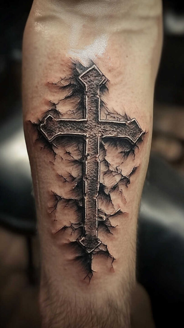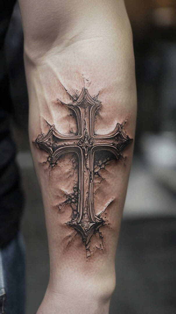 Cross tattoos with bold lines and moderate detail age gracefully.