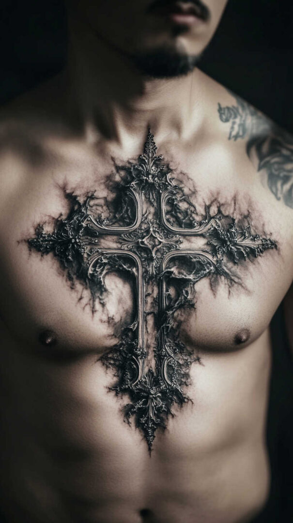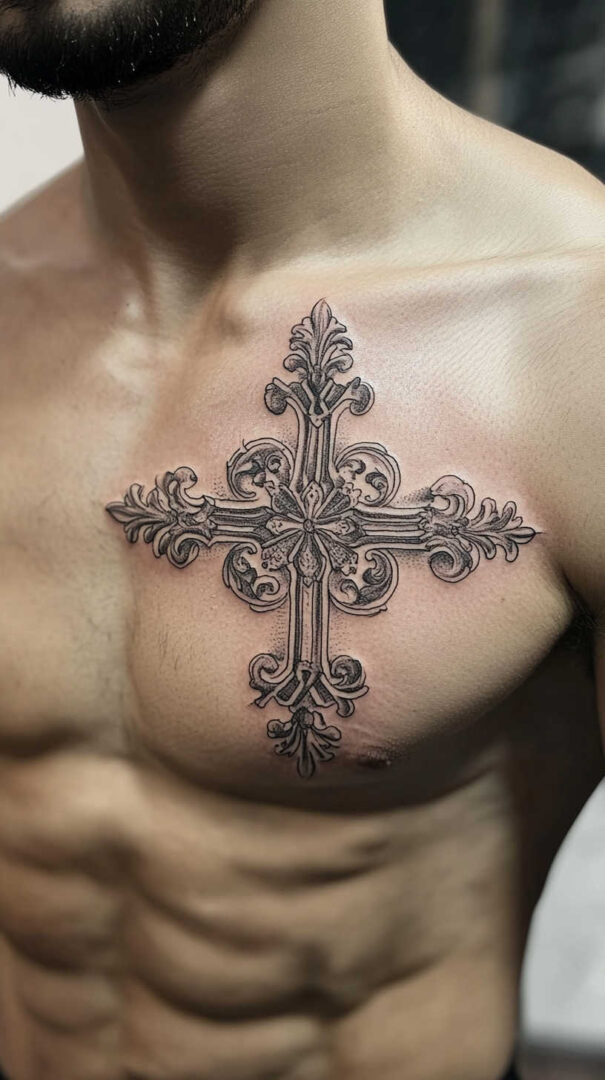 - Chest / Sternum — Central Latin or Gothic cross over the heart for faith and protection.