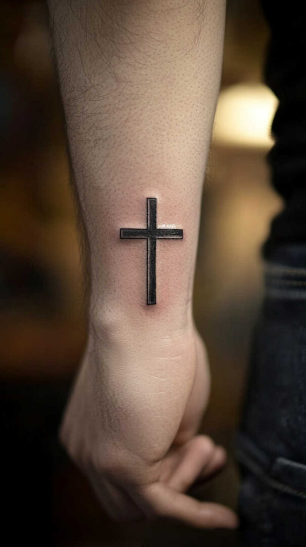 - Forearm / Wrist — Smaller, vertical cross for daily visible reminder.