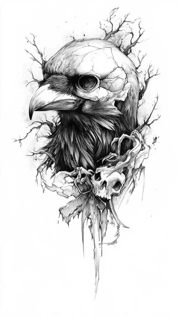 Decaying crow designs explore themes of life and death, with elements like exposed bones or wilting features. These sketches in HD capture intricate decay patterns, adding depth to the symbolism. Crow and skull combinations highlight mortality, with the bird’s intelligence contrasting the skull’s finality.