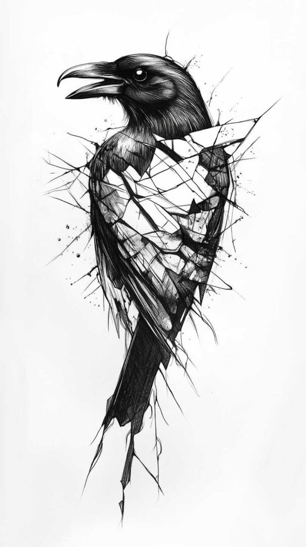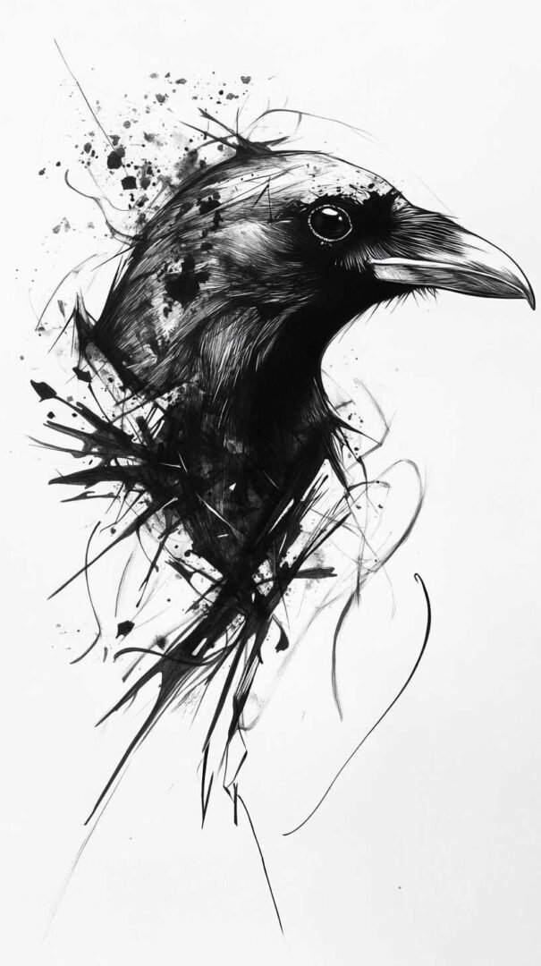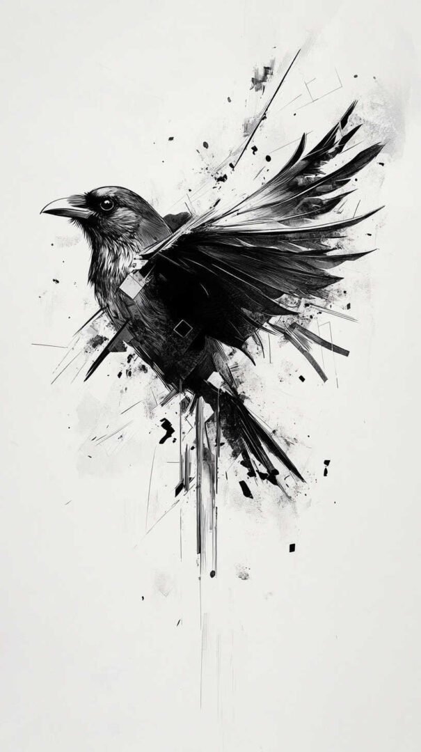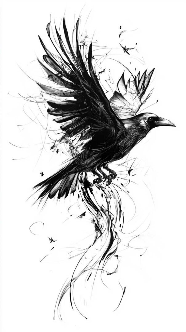 Abstract styles push boundaries, depicting crows with smoke effects or fragmented wings for a surreal vibe. In 4K HD sketches, these incorporate digital effects like blurring or particle dispersion, creating dynamic visuals. Crow feather tattoos symbolize subtle transformation, often rendered with flowing lines that look ethereal in high resolution.