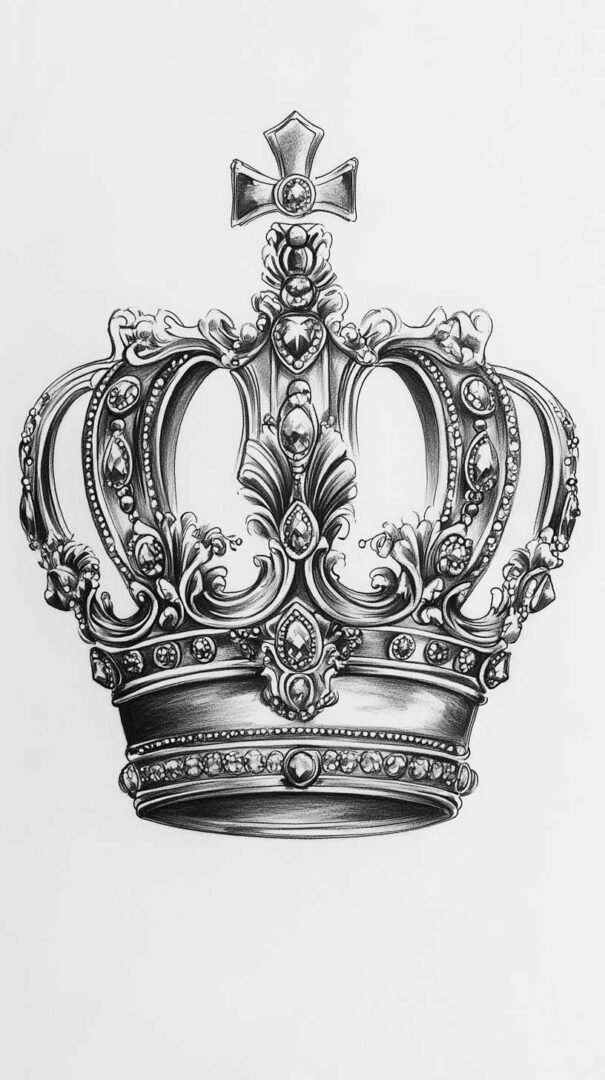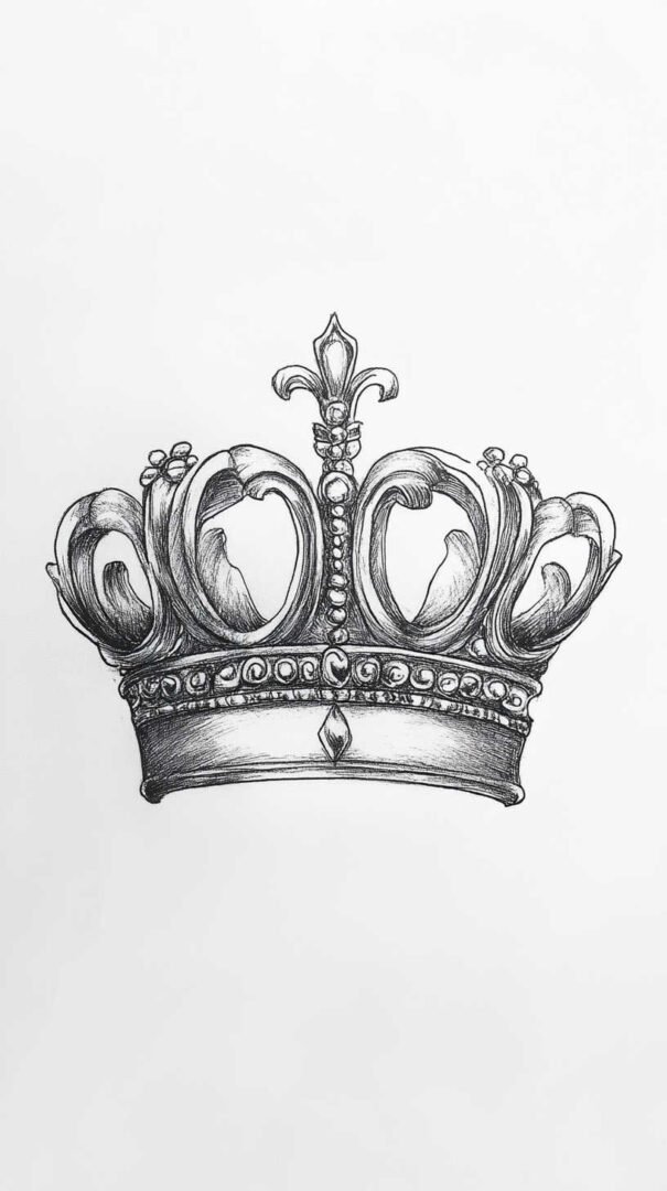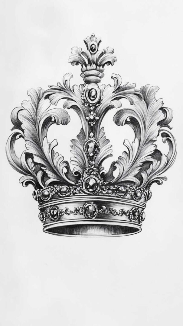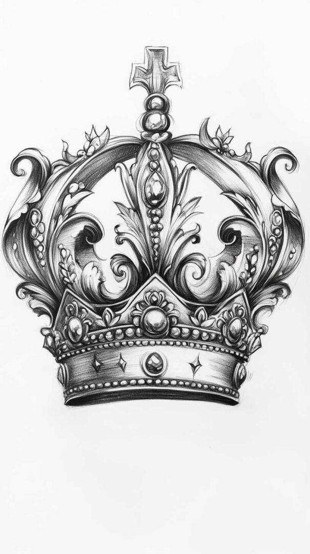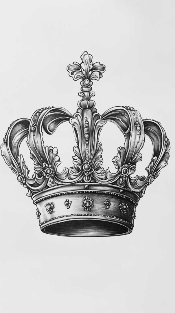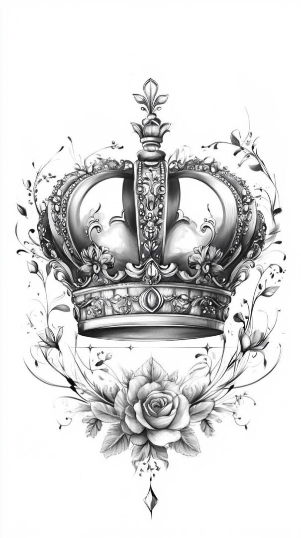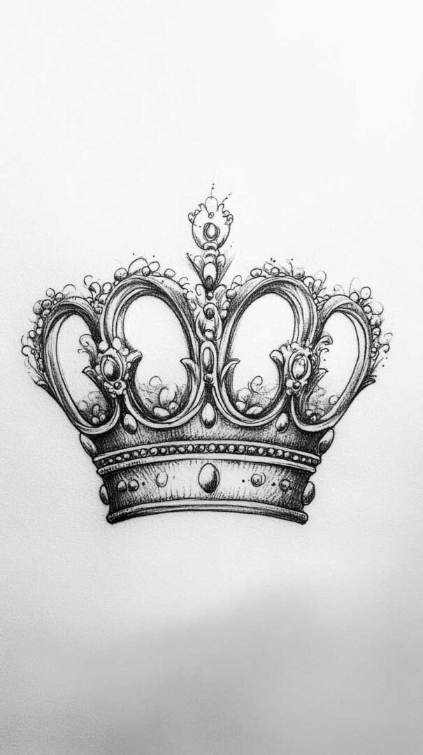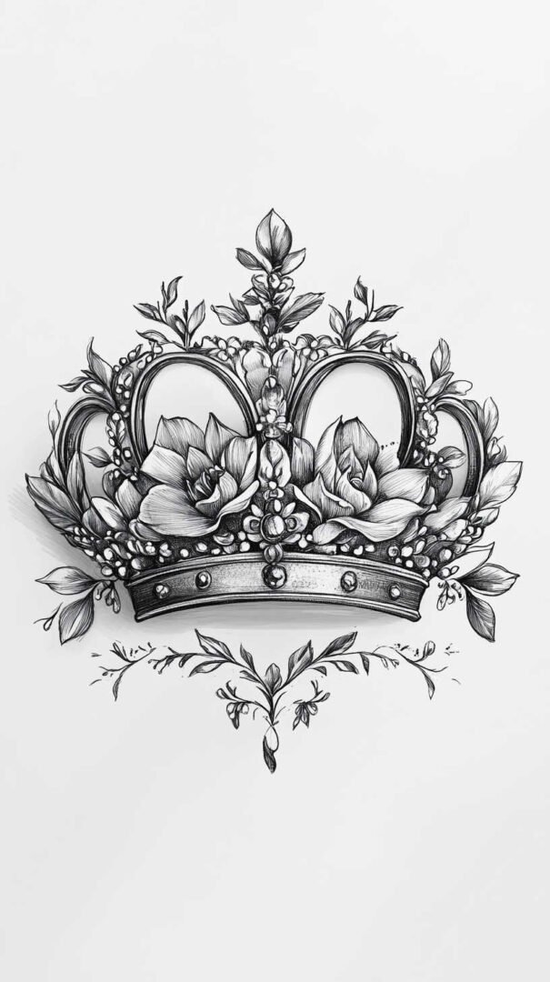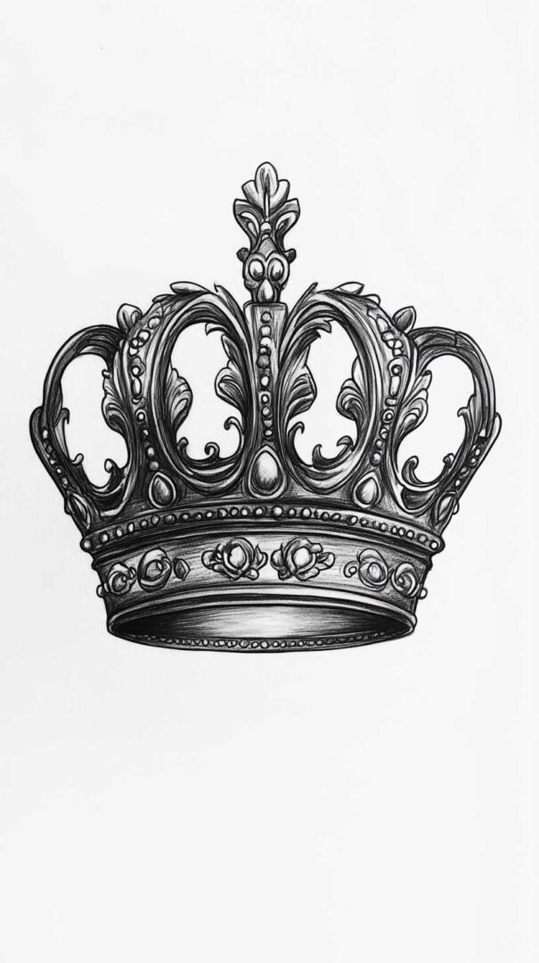 For a feminine touch, consider a tiara-like crown with delicate filigree and floral accents. These sketches in 4K reveal subtle gradients in the metalwork, ideal for collarbone or ankle tattoos. Add personalization with initials woven into the base, symbolizing family or self-identity.