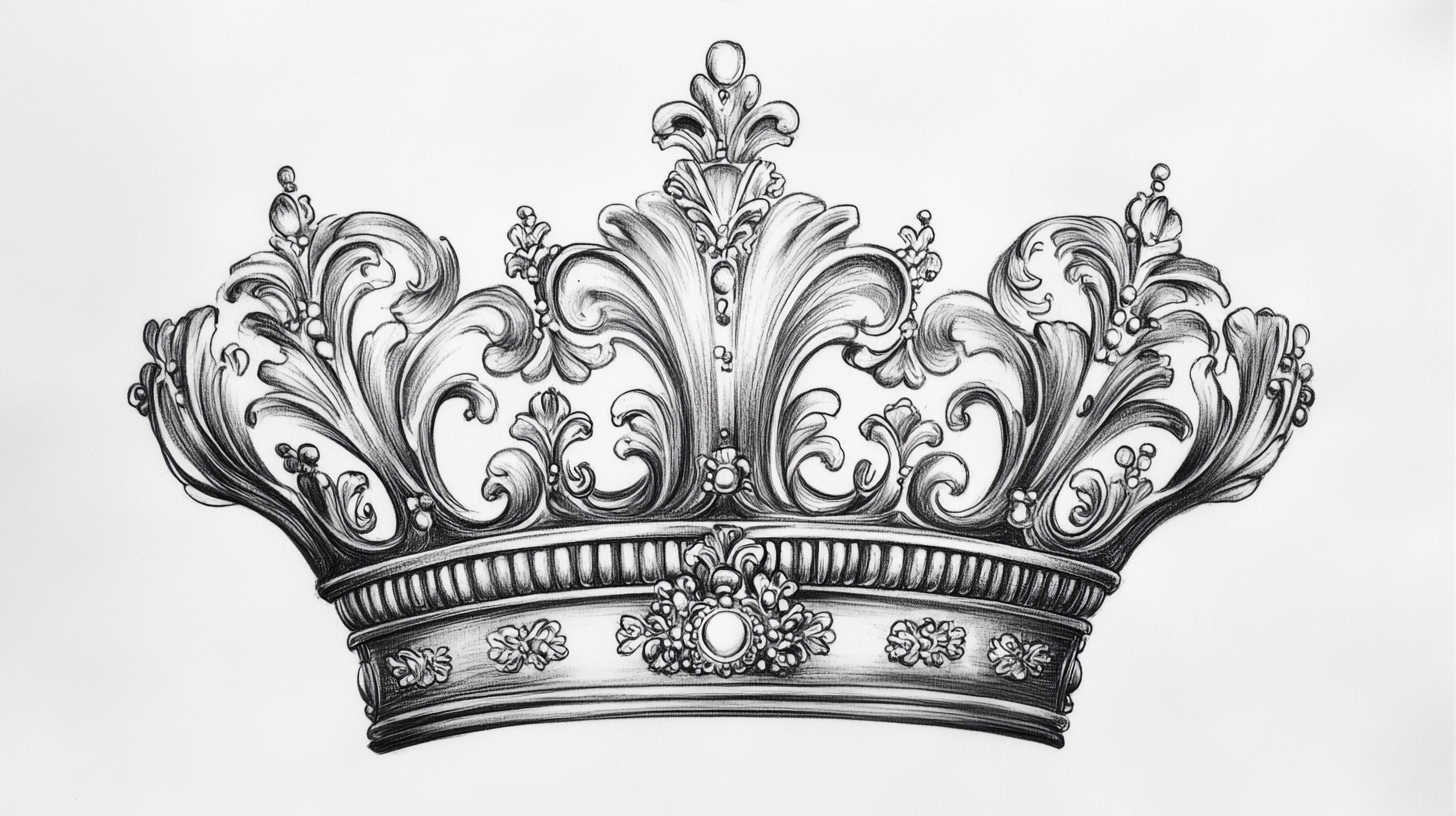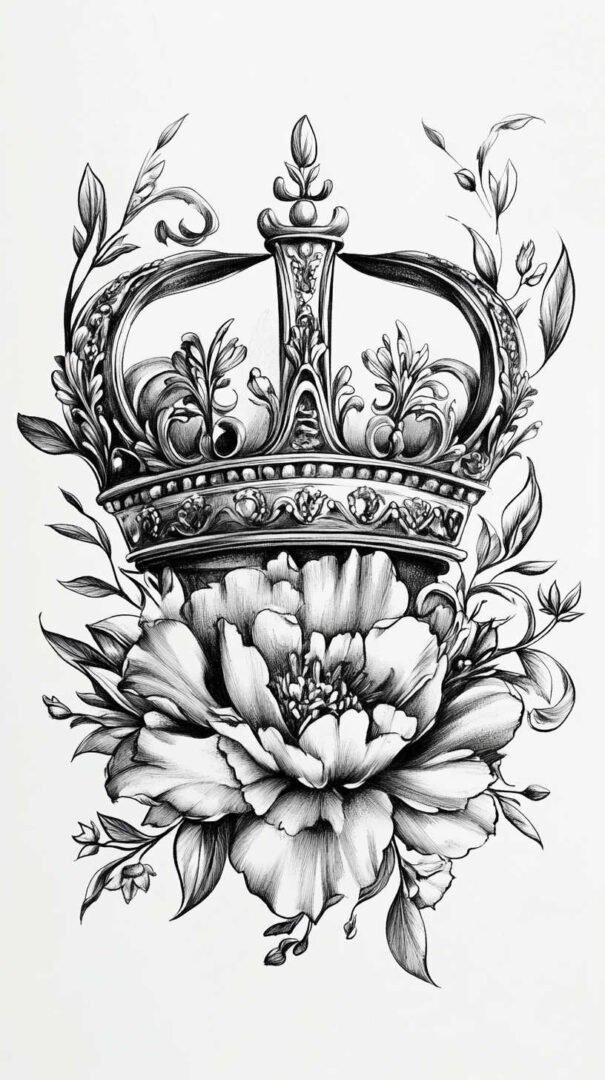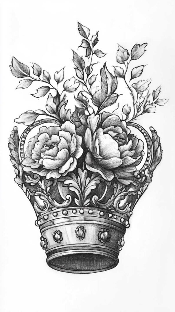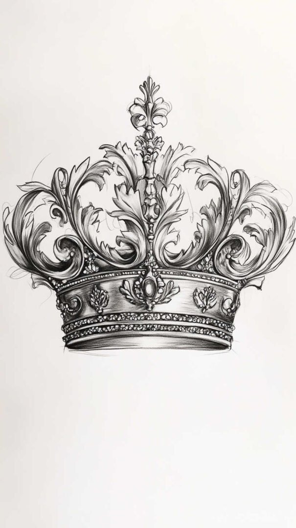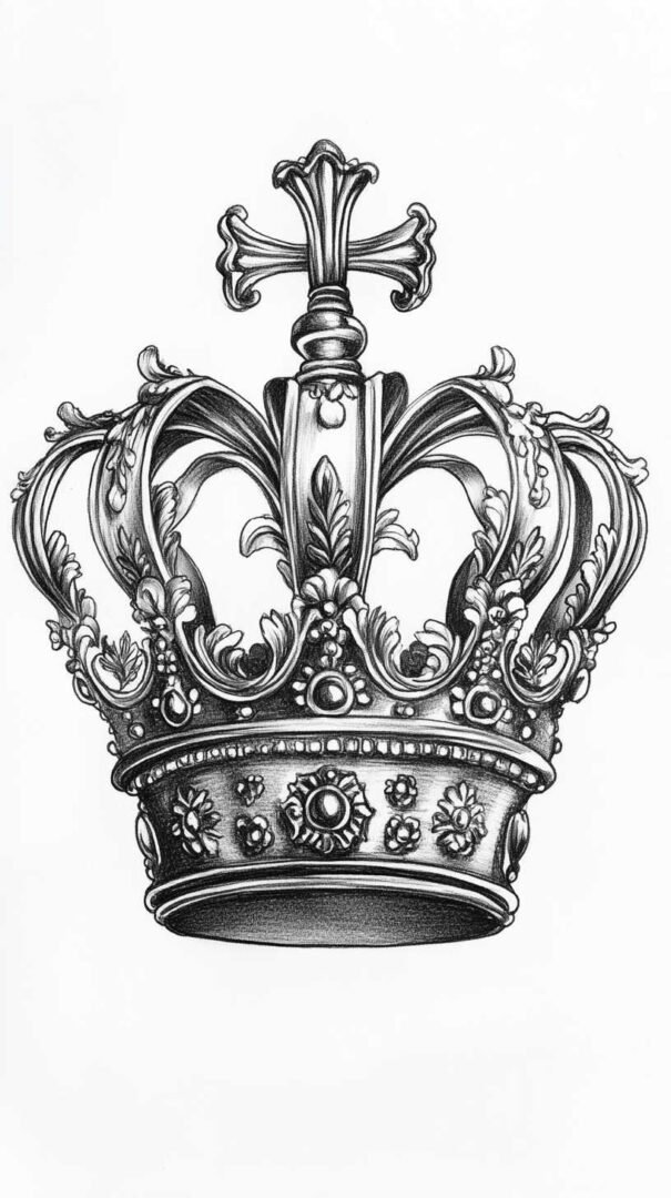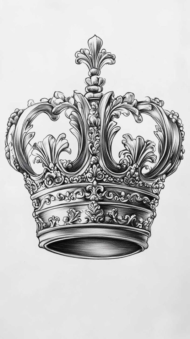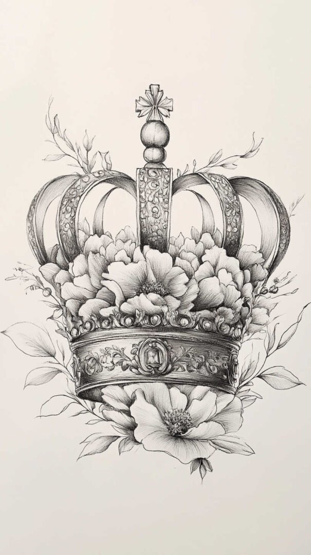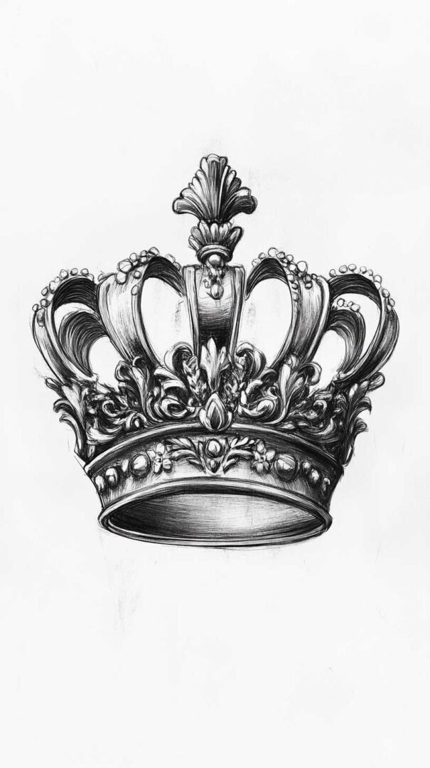 For a feminine touch, consider a tiara-like crown with delicate filigree and floral accents. These sketches in 4K reveal subtle gradients in the metalwork, ideal for collarbone or ankle tattoos. Add personalization with initials woven into the base, symbolizing family or self-identity.