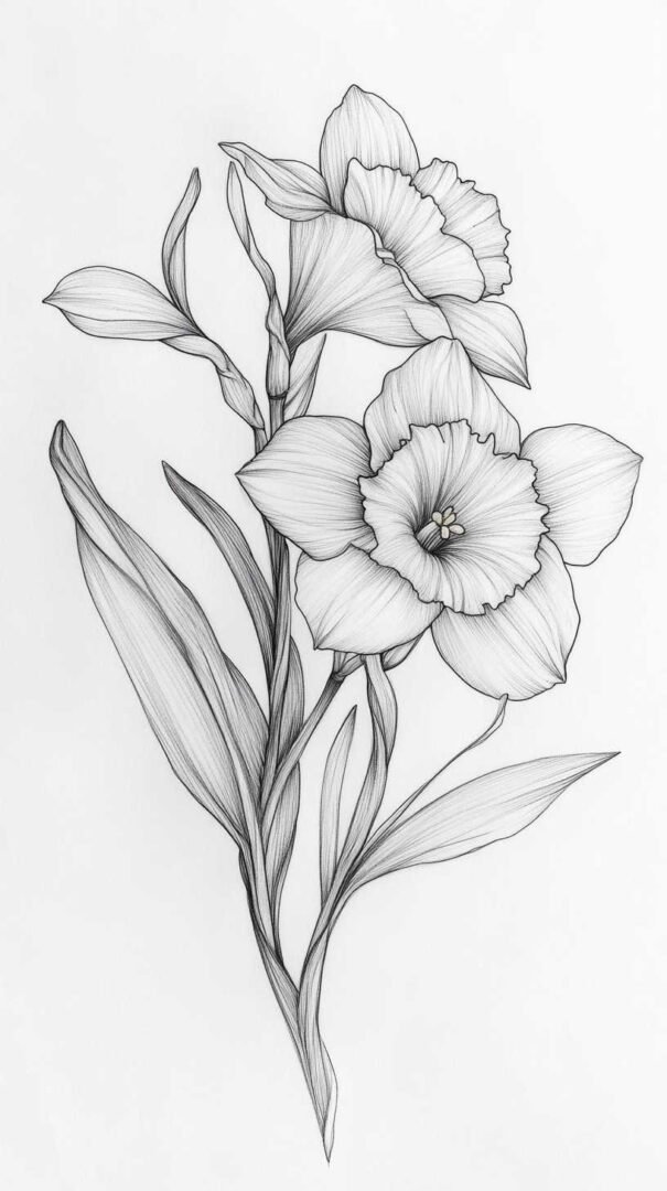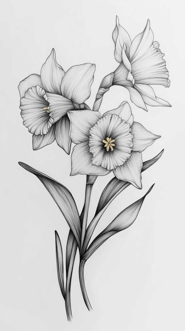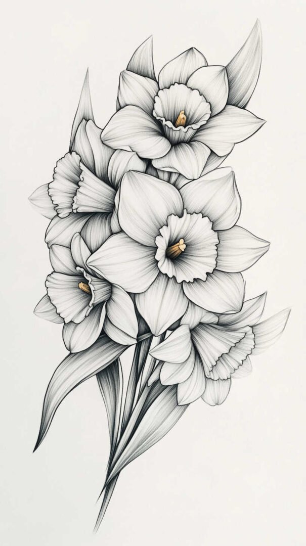 Daffodil sketches offer endless customization. A single bloom stands alone for understated beauty, while clusters or bouquets create fuller compositions. Adding stems and leaves introduces flowing lines that wrap around body contours.