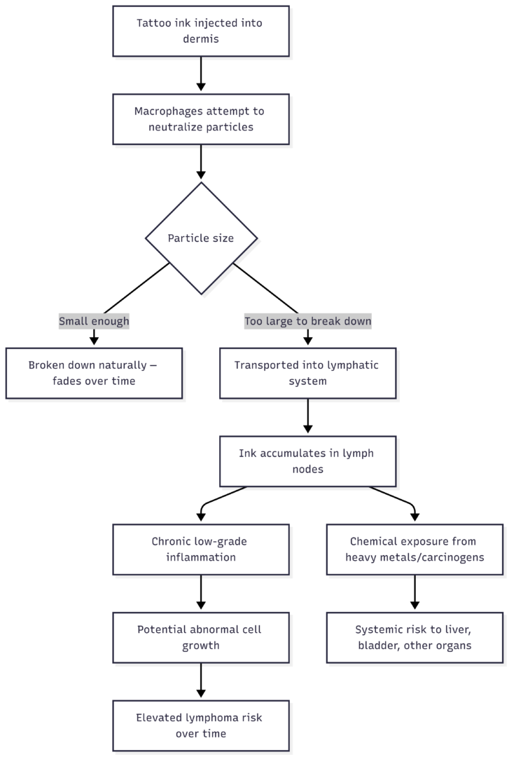 Available evidence suggests that lymphoma risk increases more sharply following laser removal than with the original tattoo. Smaller post-laser particles may also be more capable of crossing cell membranes—raising the possibility of direct cellular damage that isn’t present with intact, larger ink particles.