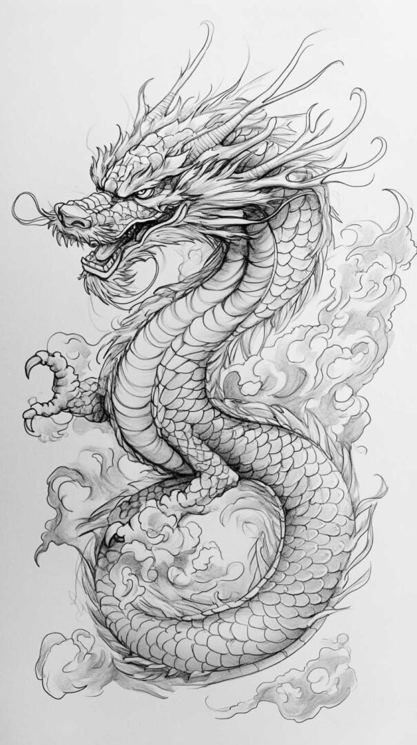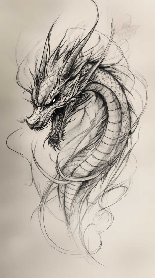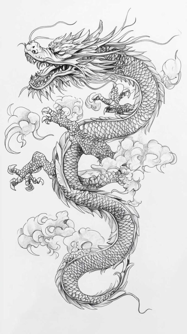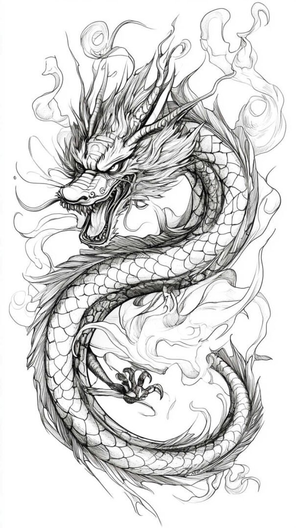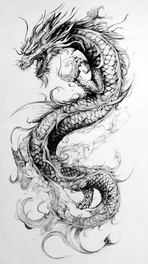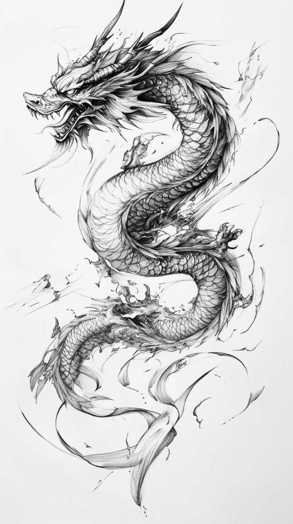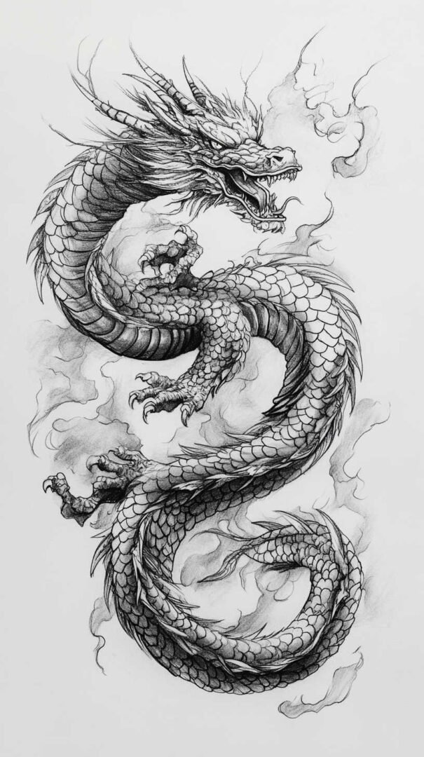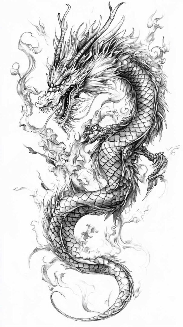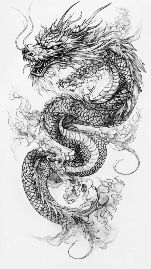 Dragon sketches offer endless customization. Common motifs include dragons clutching pearls (enlightenment), breathing fire (passion and transformation), or entwined with flowers, swords, or skulls for layered storytelling.