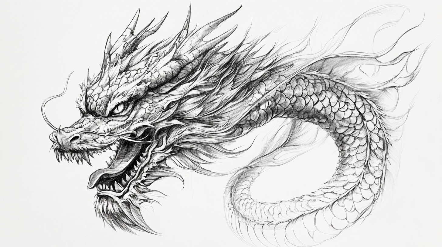 Color considerations influence sketch planning—red for intensity and luck, blue for serenity and water control, black for mystery and strength, gold for divine kindness. Monochrome high-definition sketches rely on masterful gradients, cross-hatching, and stippling to suggest hue and texture.
