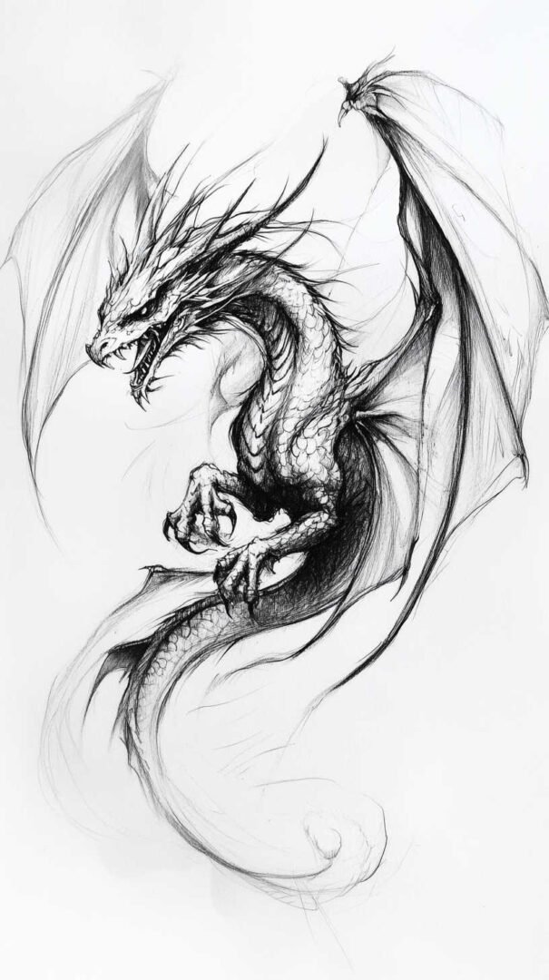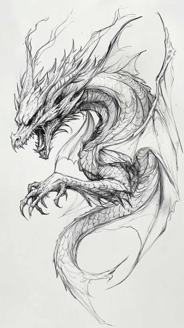 Western interpretations contrast sharply, portraying dragons as fierce, winged beasts with scales, horns, and fiery breath. These sketches emphasize conquest, raw power, and the triumph over adversity. A typical Western dragon design might show the creature coiled aggressively, wings spread wide, mouth open in a roar, evoking themes of guardianship against chaos or personal battles won.