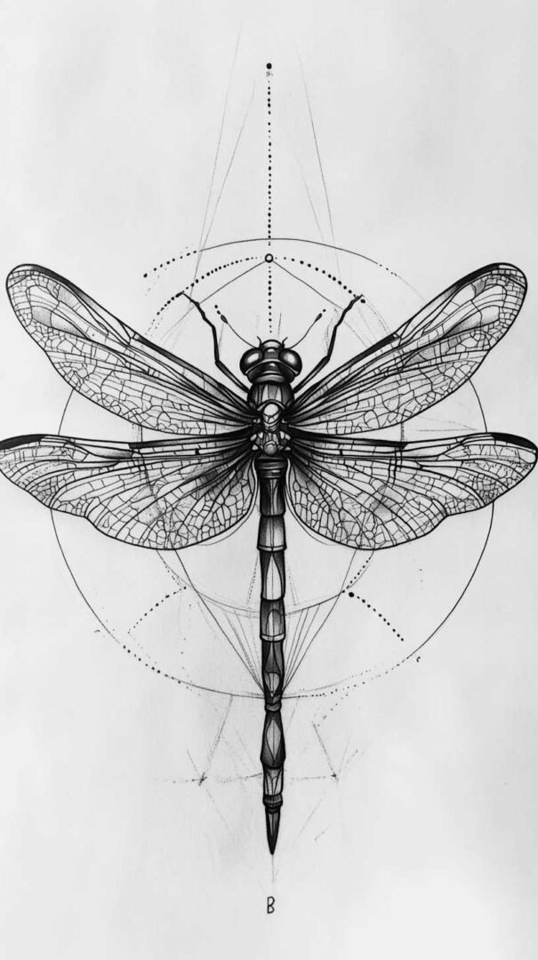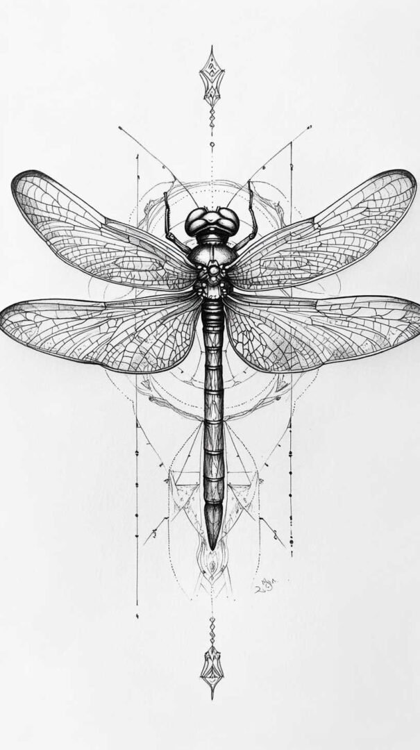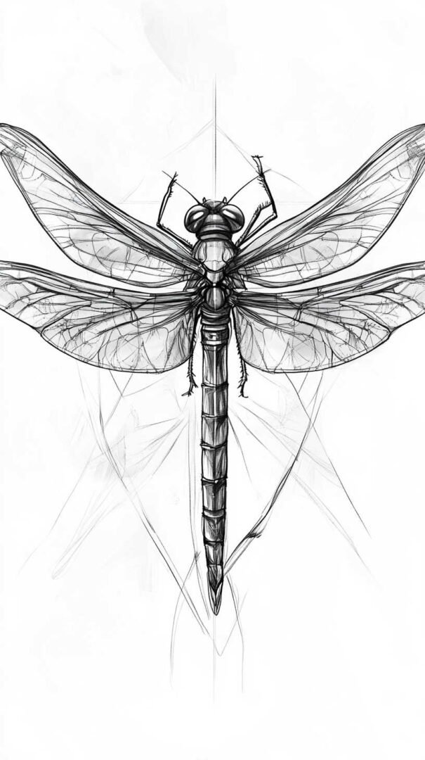 Geometric dragonfly sketches use shapes like triangles and circles to construct the form. In 4K, precision is key, ensuring alignments are flawless.