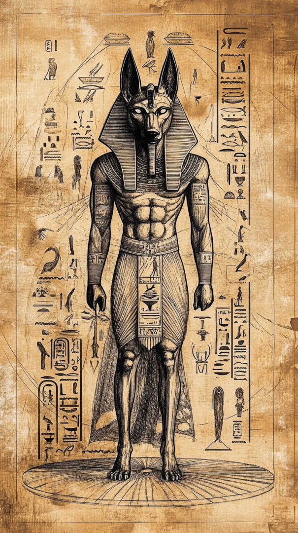 - Anubis — Jackal-headed god of mummification; weighing heart scenes or standing guardian pose.