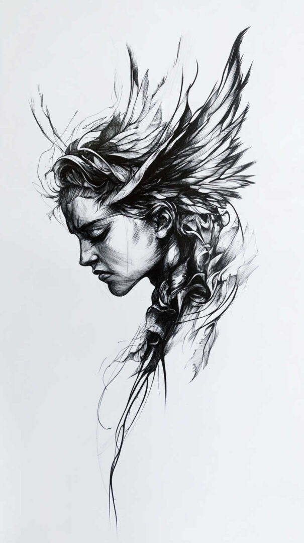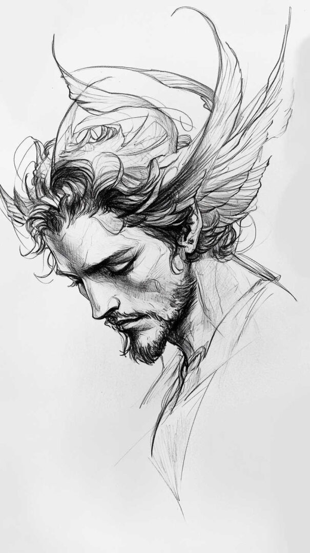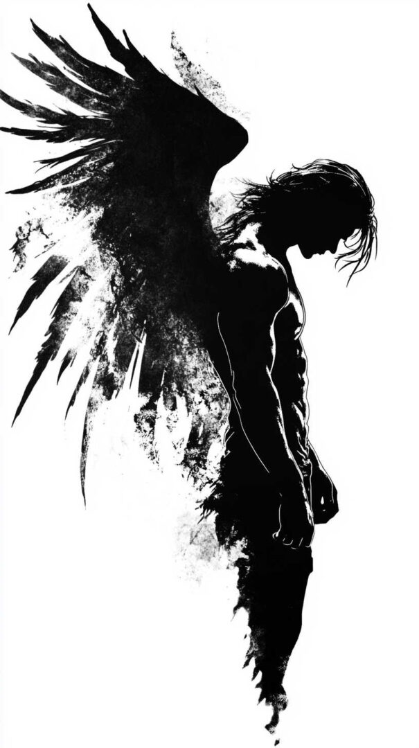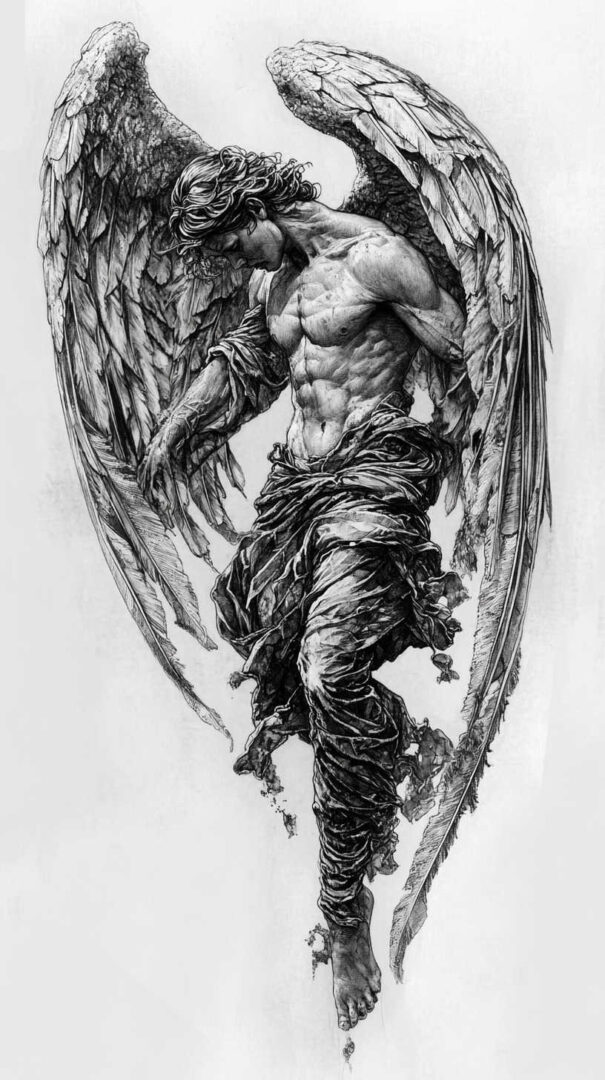 Fallen angel tattoo sketches explore the tragic beauty, rebellion, loss of grace, and complex redemption of celestial beings cast out from heaven. These designs often depict majestic wings that are broken or tattered, sorrowful or defiant expressions, torn halos, and dramatic lighting that highlights the contrast between divine origin and earthly fall. In 4K HD quality, sketches reveal exceptional detail — realistic feather textures with damaged or missing plumes, muscular anatomy under torn robes, glowing or dimmed halos, subtle tear streaks, and powerful shading gradients — providing lifelike blueprints that convey deep emotion and inner conflict.