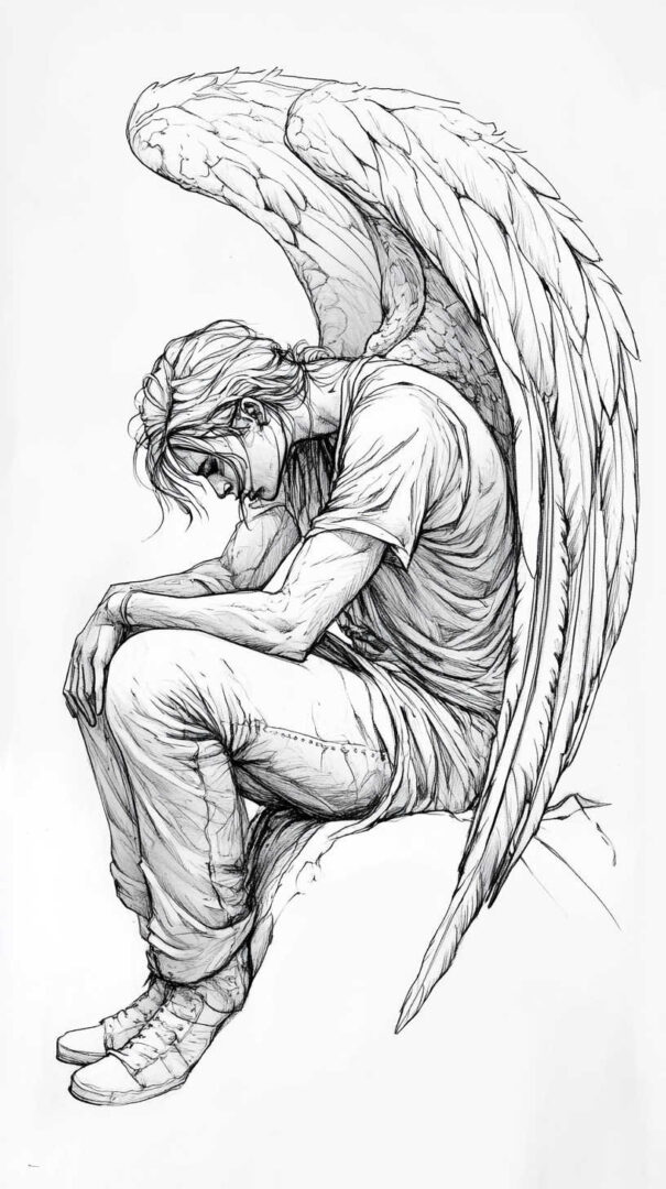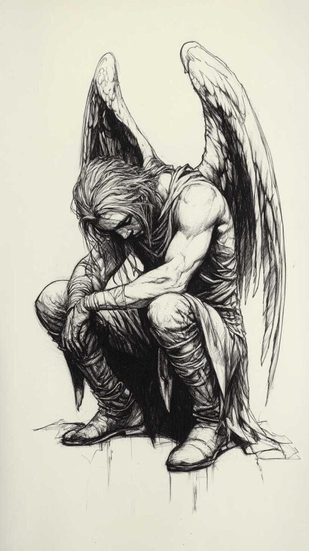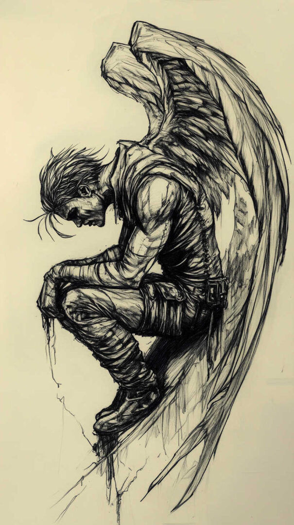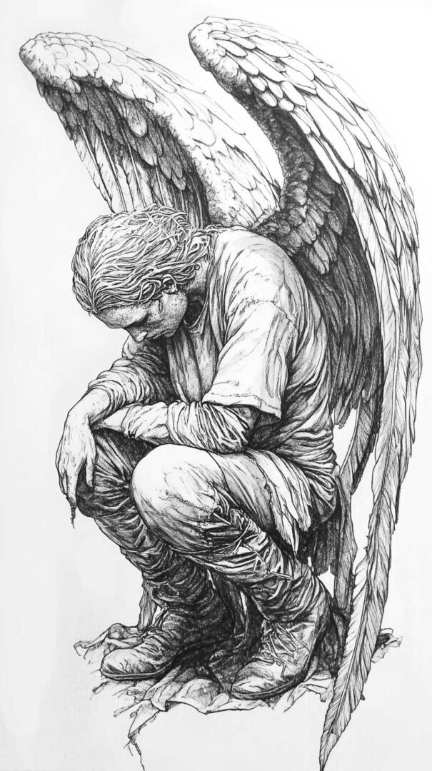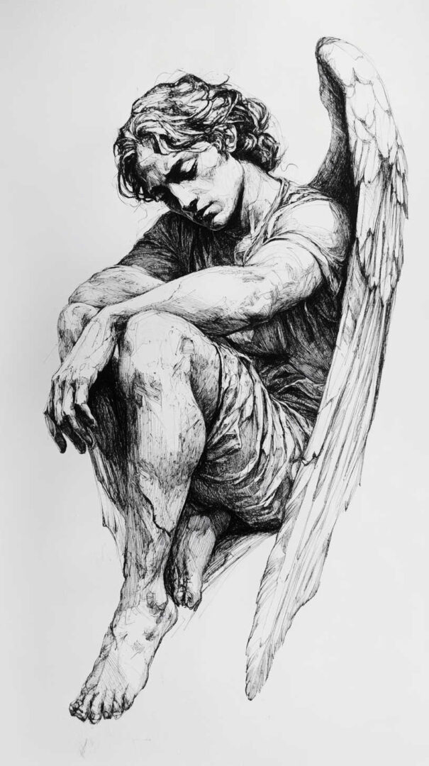 Hyper-realistic fallen angel sketches emphasize emotional depth and physical tragedy.