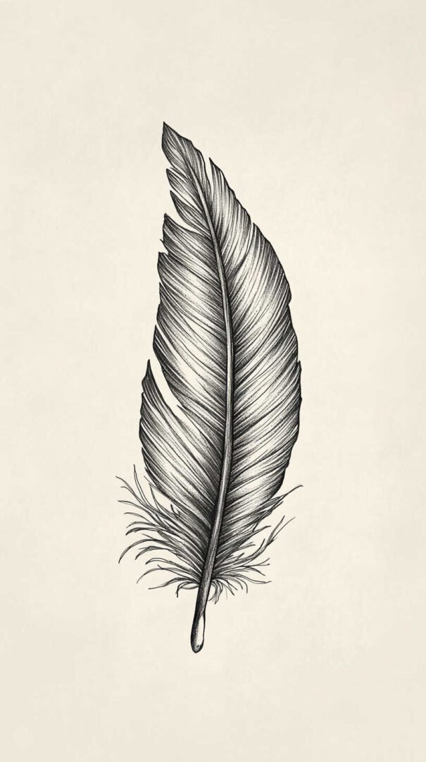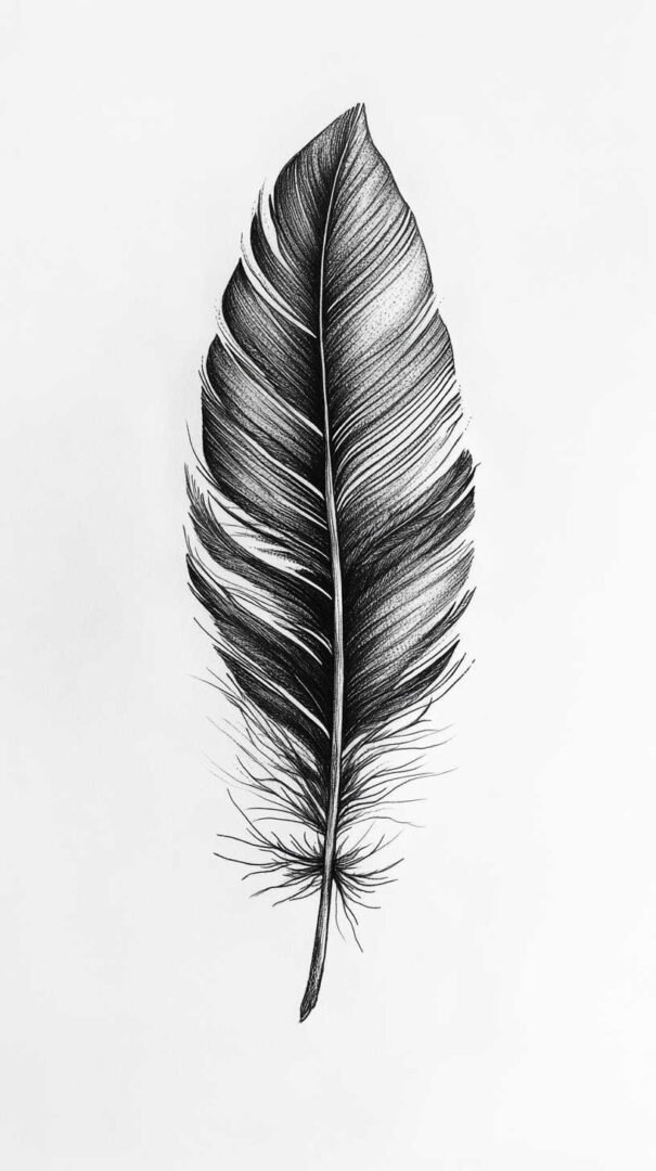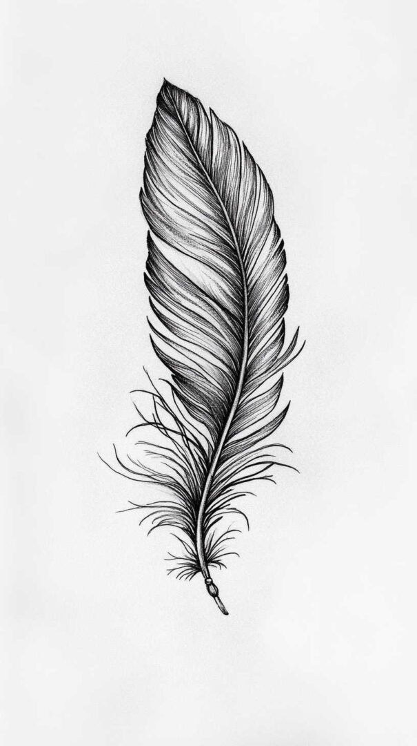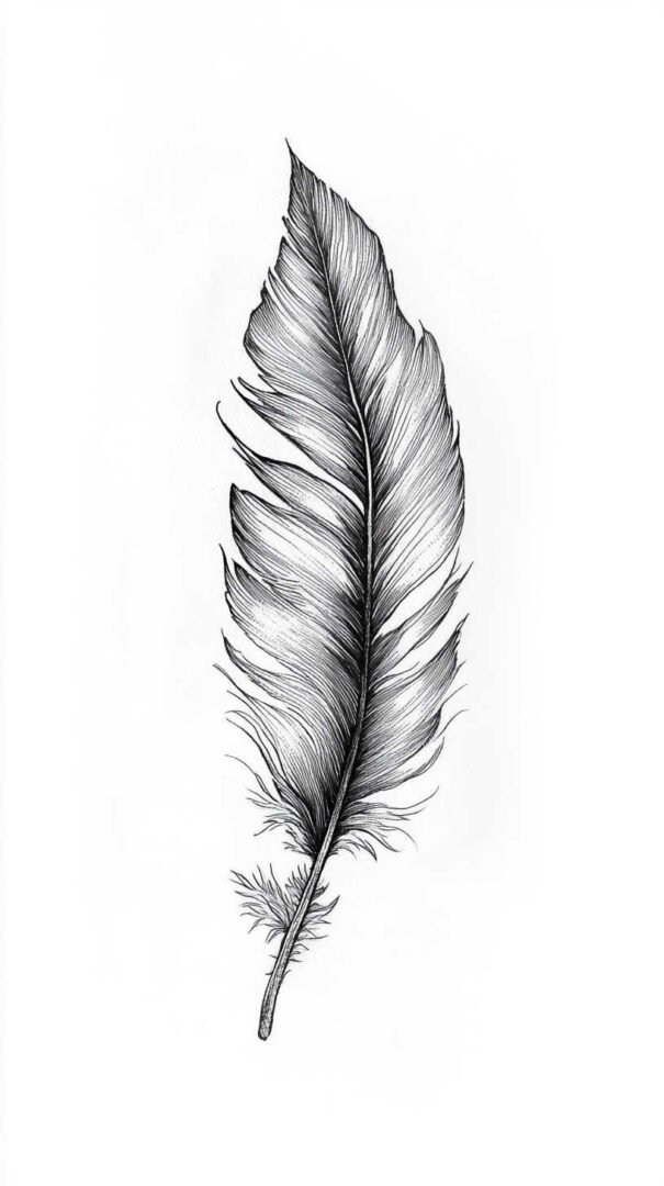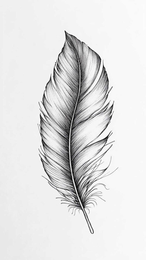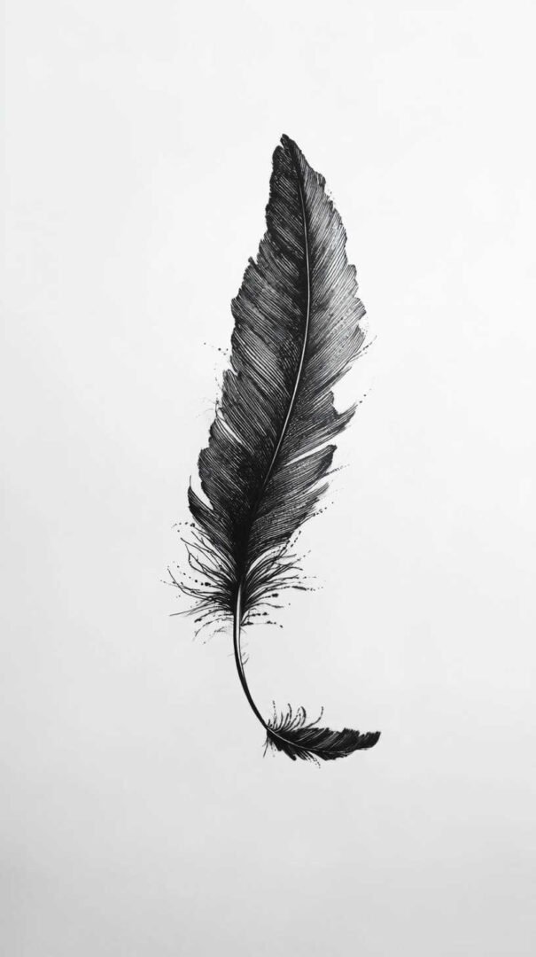 Minimalist feather sketches emphasize clean lines and negative space. These designs feature a single, slender feather with minimal shading, focusing on elegant curvature and precise barb details. The simplicity makes them ideal for subtle statements, where the feather appears almost ethereal, floating delicately on the skin. High-definition rendering highlights the fine precision, ensuring every line remains crisp even in close-up views.