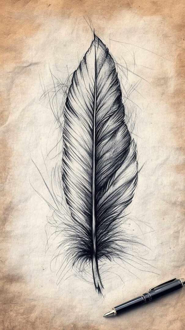 Pure feather sketches shine on their own, but many artists enhance them with complementary elements for added narrative power. A solitary feather remains timeless, but variations expand expressive possibilities.
