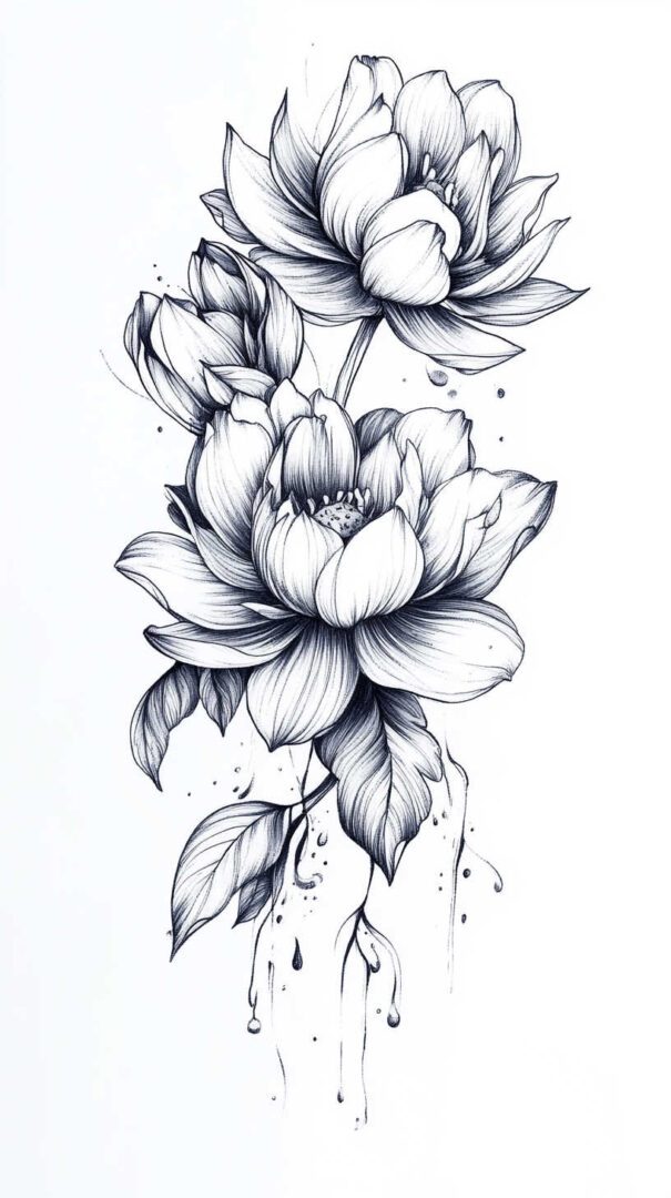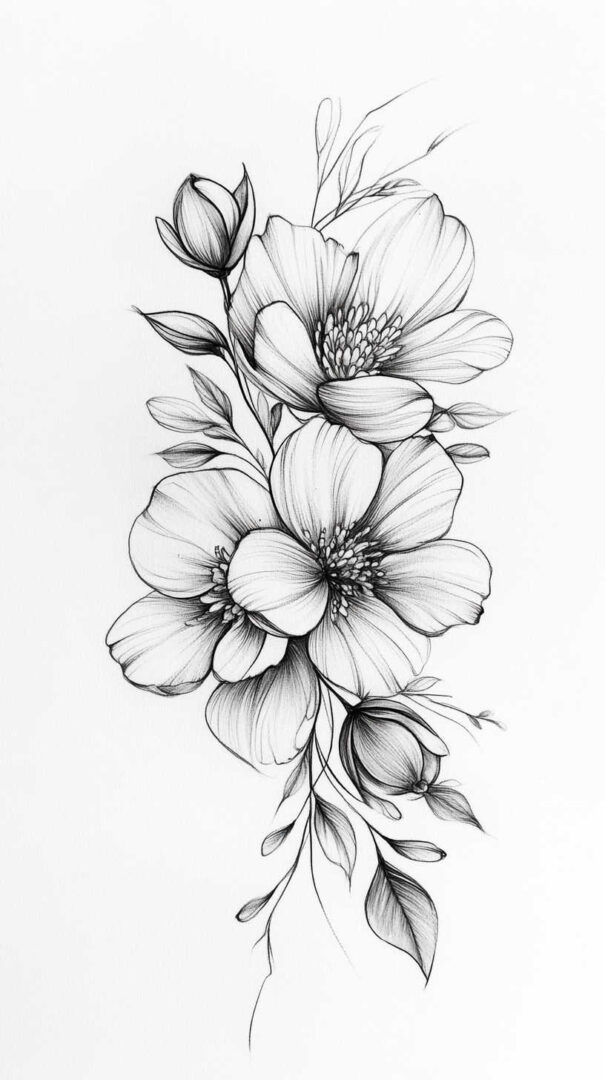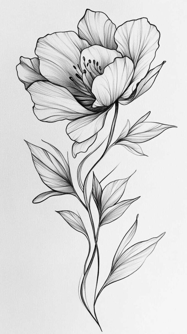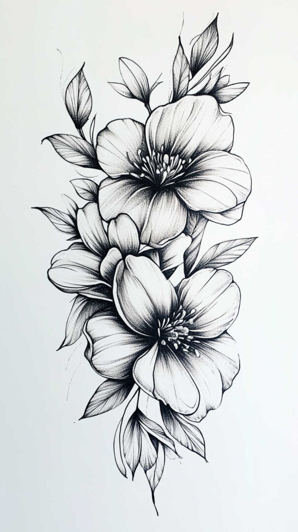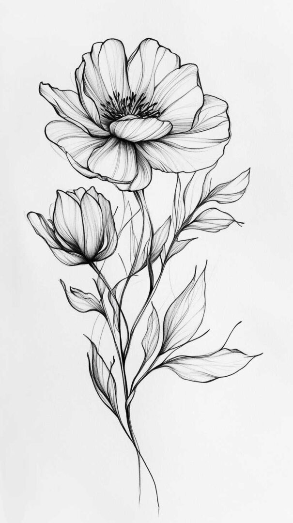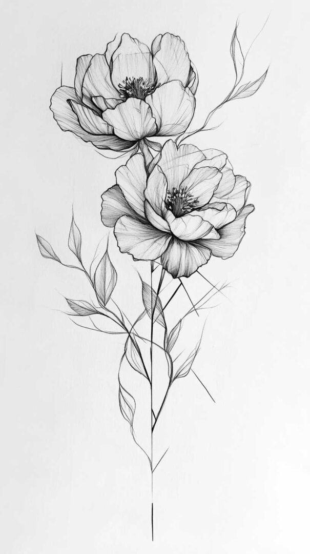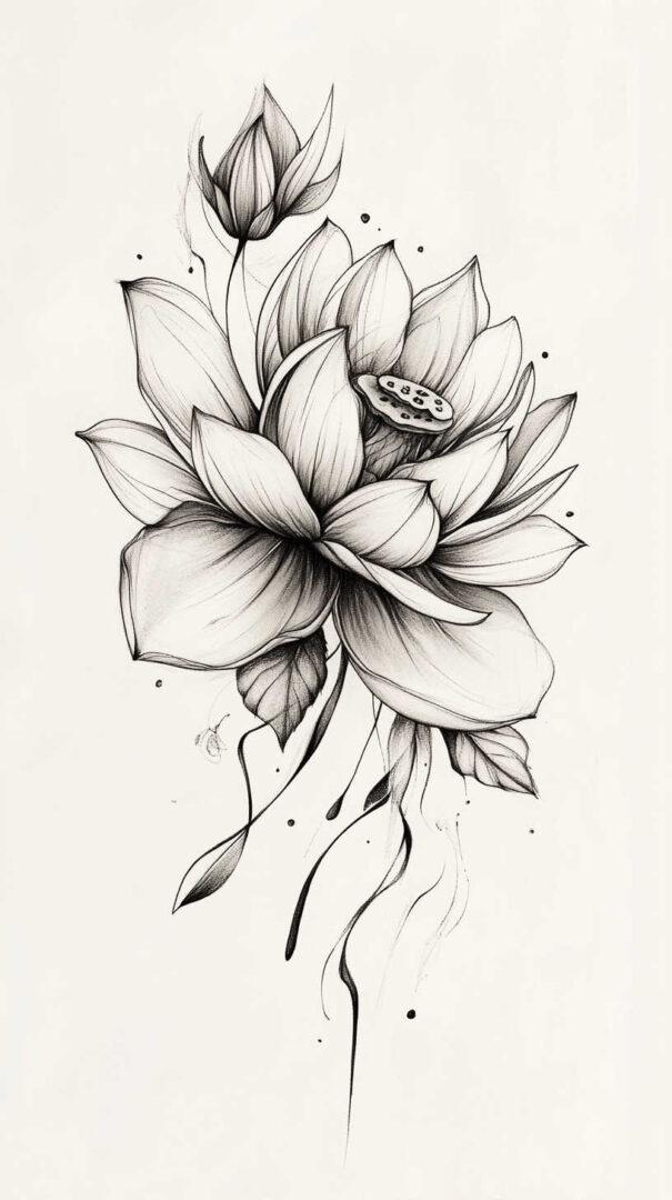 Flower tattoos appeal to both men and women, offering endless customization. They can be small and minimalist or large and elaborate, realistic or stylized. High-resolution sketches emphasize natural movement, negative space, and how light interacts with petal edges for lifelike results.