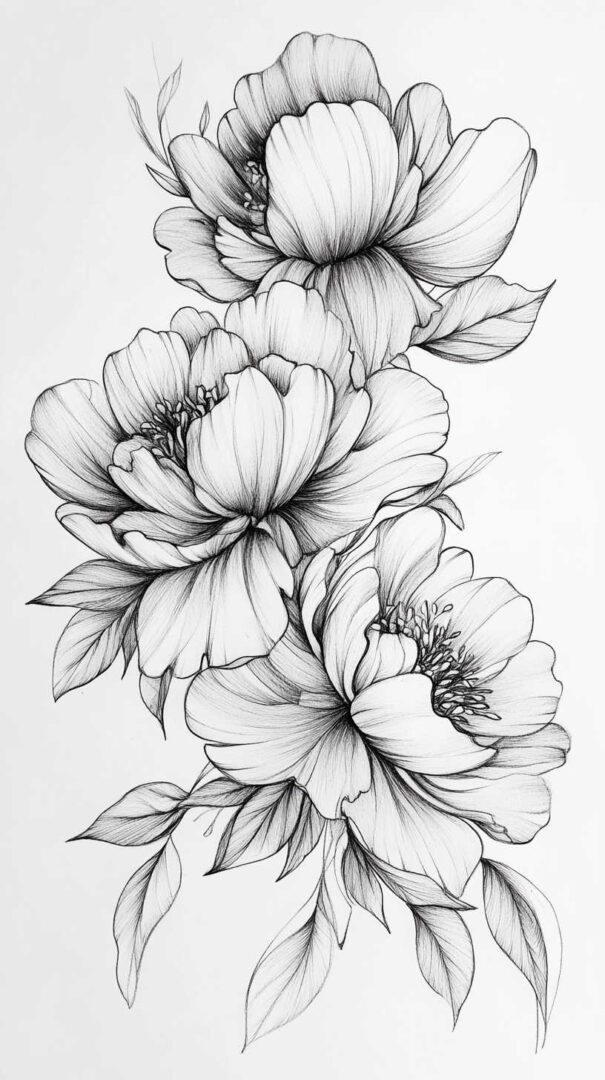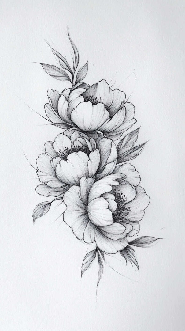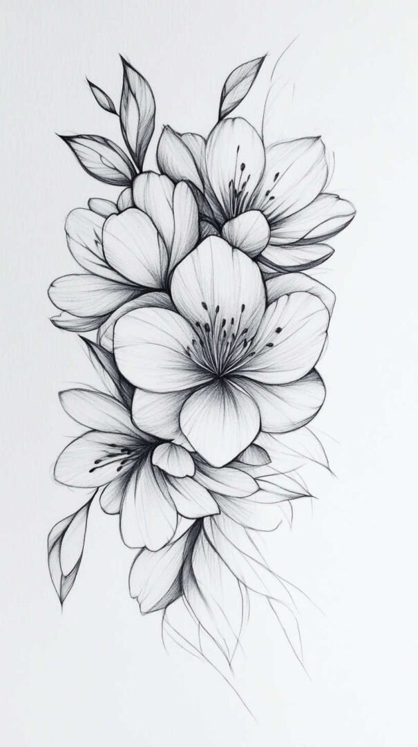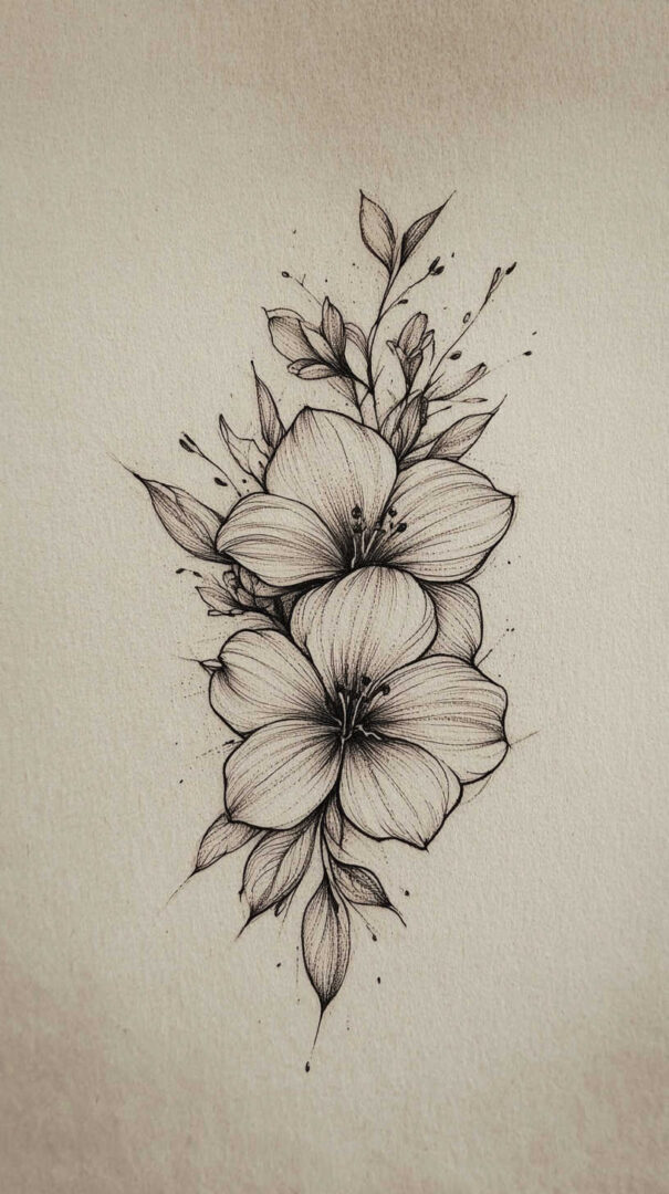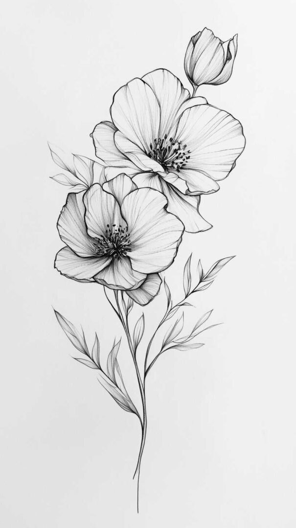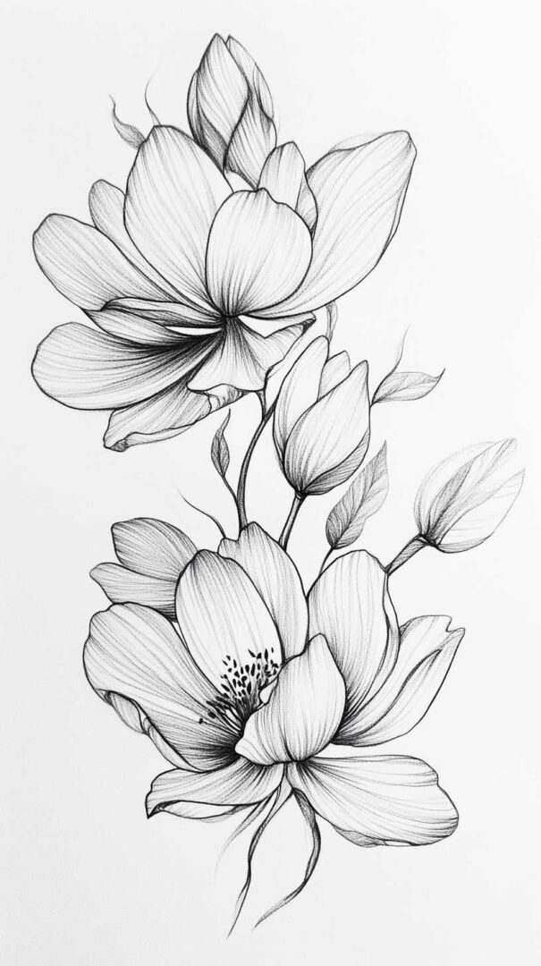Flower tattoos appeal to both men and women, offering endless customization. They can be small and minimalist or large and elaborate, realistic or stylized. High-resolution sketches emphasize natural movement, negative space, and how light interacts with petal edges for lifelike results.