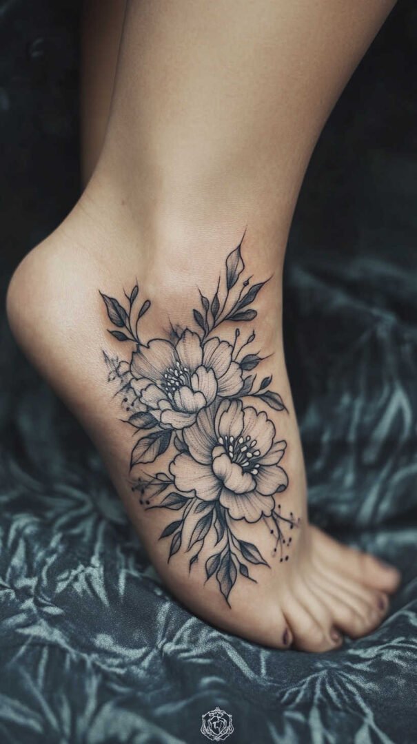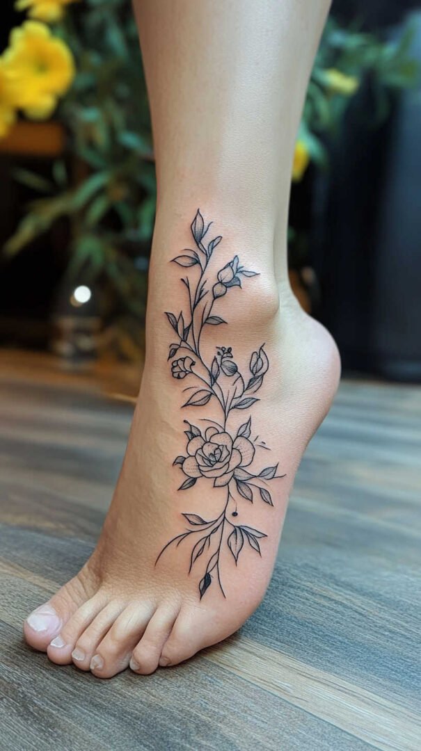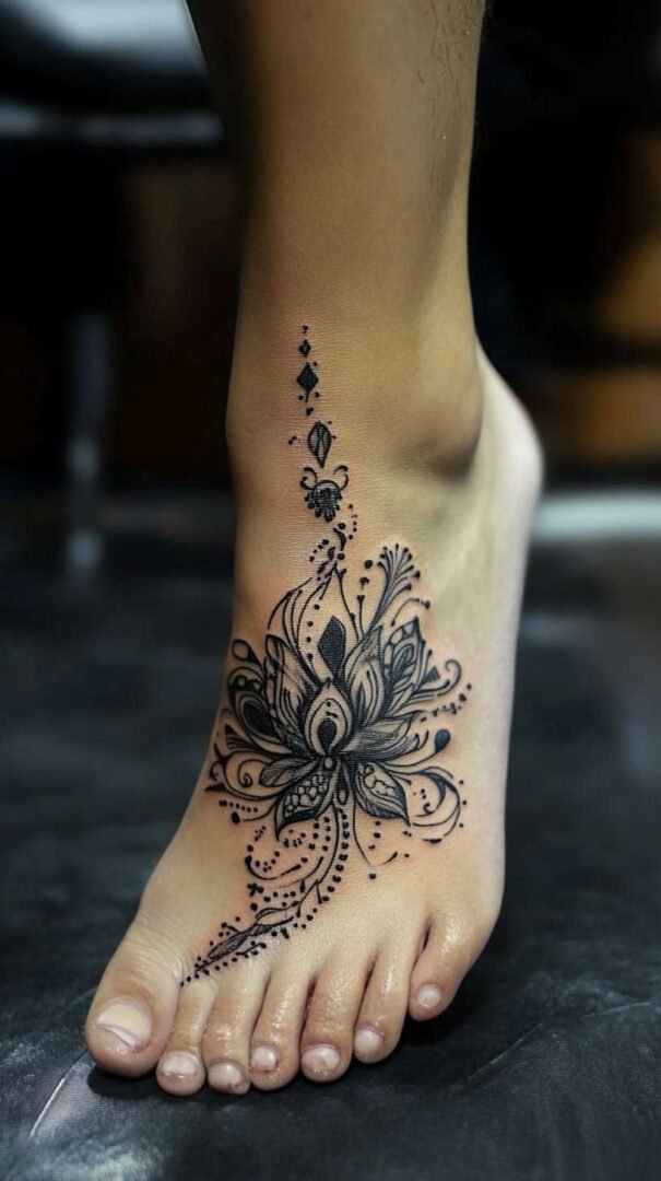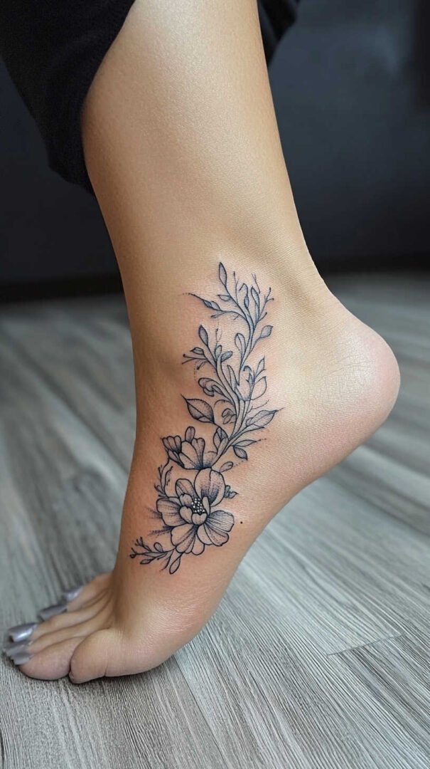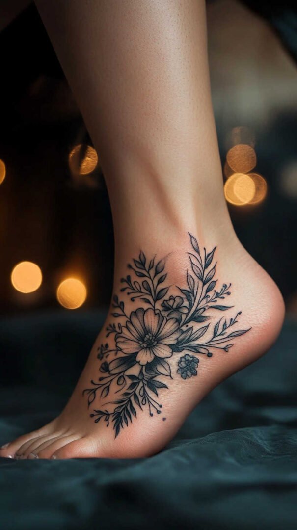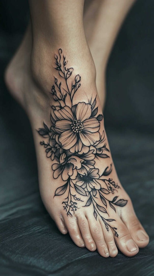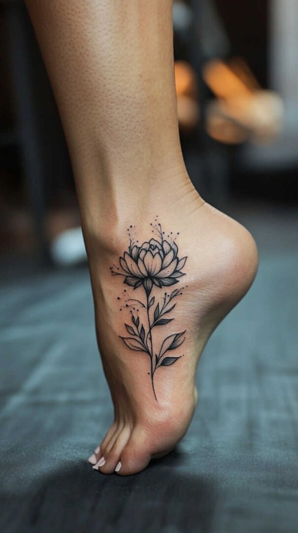 Women gravitate toward designs emphasizing grace, nature, and personal significance. Floral motifs dominate, symbolizing beauty, growth, resilience, and femininity. Roses represent passion and love, often chosen in black-and-gray for timeless elegance or soft colors for a romantic feel. Lotuses evoke purity and enlightenment, rising beautifully from “muddy” beginnings—a metaphor many women relate to personal triumphs. Daisies and wildflowers convey innocence, simplicity, and joy, perfect for a lighthearted touch. Cherry blossoms signify life’s fleeting beauty and renewal, while vines or trailing ivy add a wrapping effect that accentuates the foot’s natural curves.