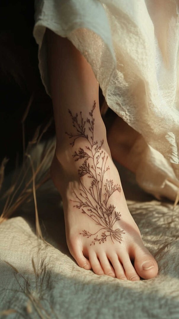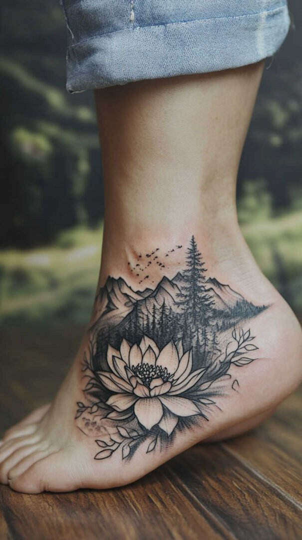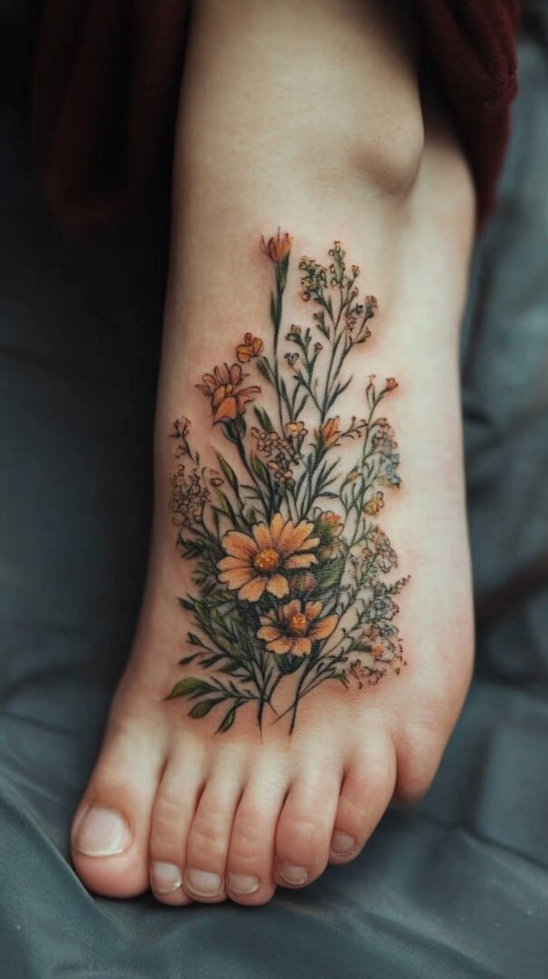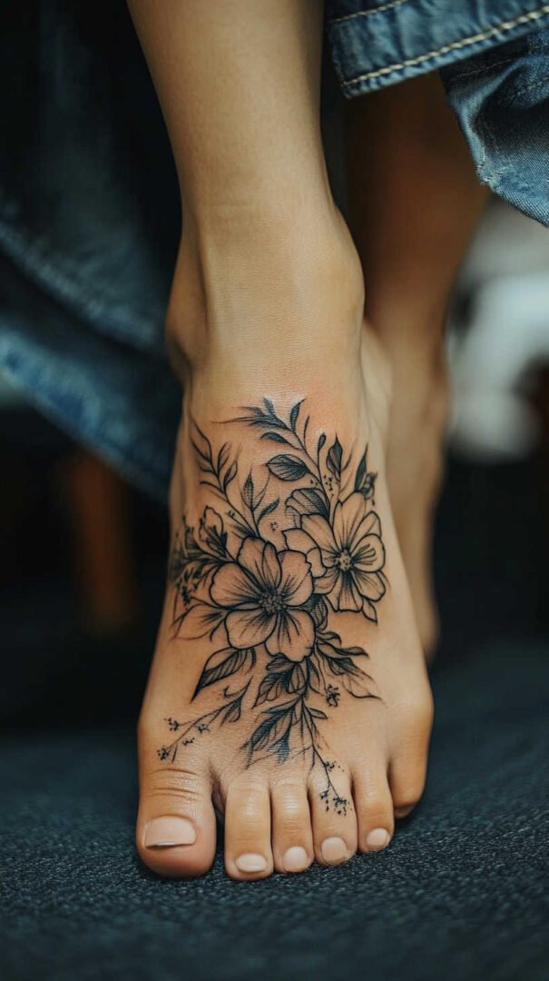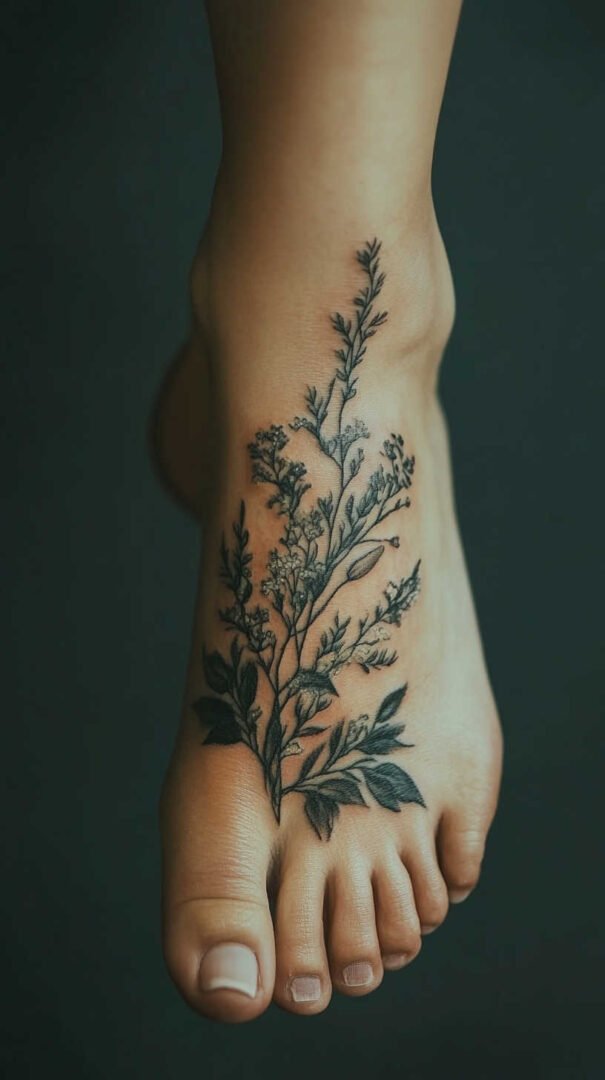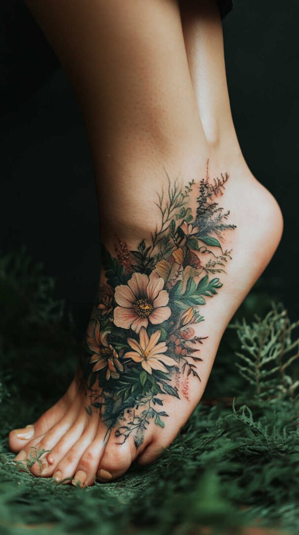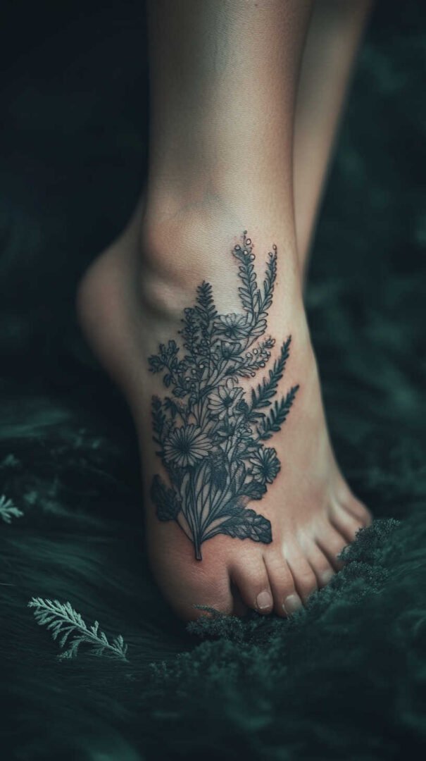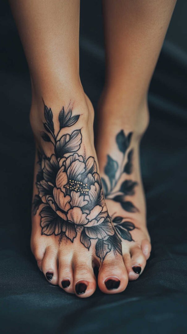 Women gravitate toward designs emphasizing grace, nature, and personal significance. Floral motifs dominate, symbolizing beauty, growth, resilience, and femininity. Roses represent passion and love, often chosen in black-and-gray for timeless elegance or soft colors for a romantic feel. Lotuses evoke purity and enlightenment, rising beautifully from “muddy” beginnings—a metaphor many women relate to personal triumphs. Daisies and wildflowers convey innocence, simplicity, and joy, perfect for a lighthearted touch. Cherry blossoms signify life’s fleeting beauty and renewal, while vines or trailing ivy add a wrapping effect that accentuates the foot’s natural curves.